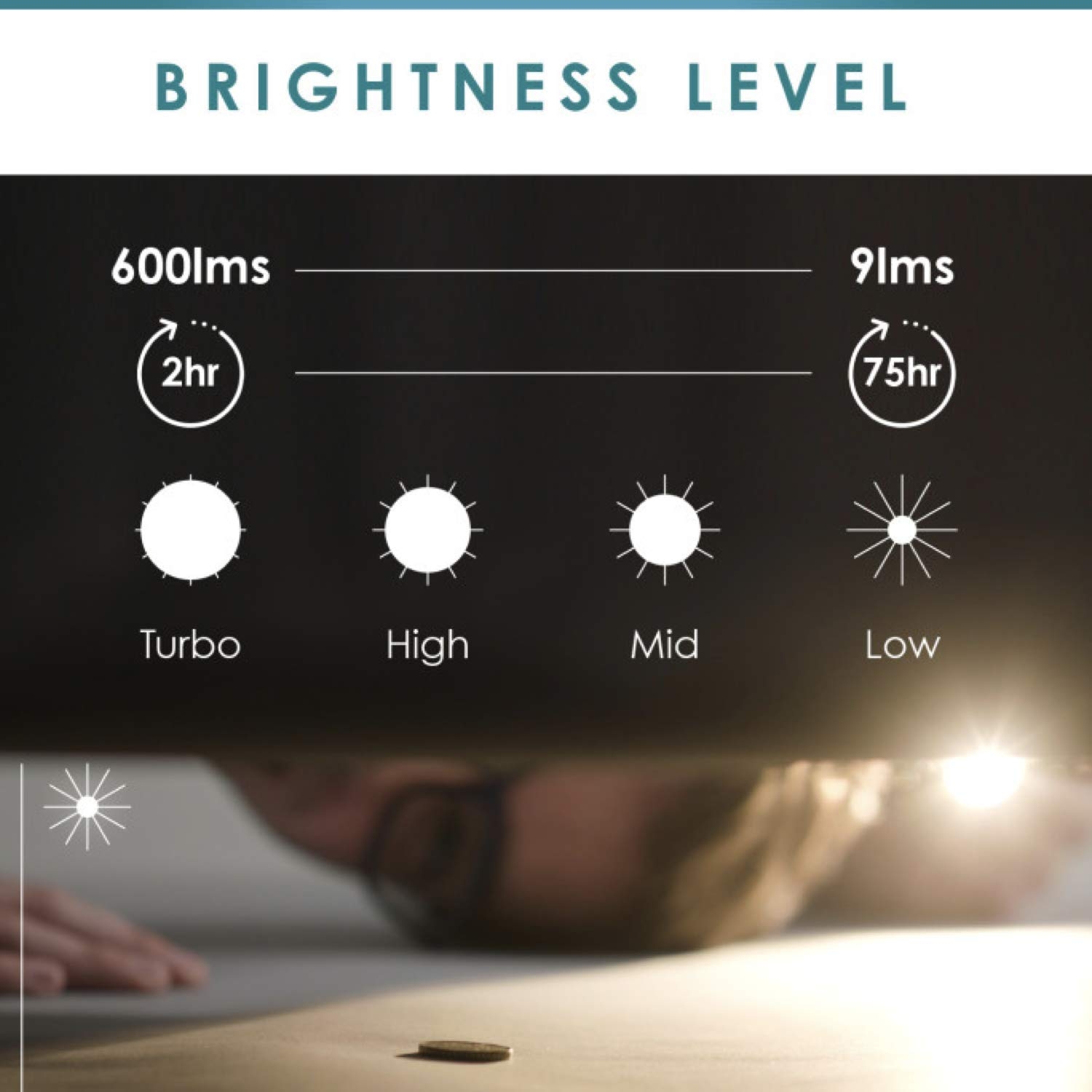 • Μέγιστη διάρκεια μπαταρίας 75 ώρες στη χαμηλότερη ένταση (9 Lumens) / 8 ώρες σε κανονική ένταση