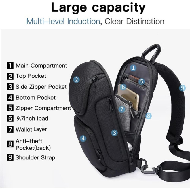 Εσωτερικά διαθέτει μία κύρια τσέπη, η οποία μπορεί να χωρέσει 1 μπλουζάκι ή ένα βιβλίο Β5 ή μία μικρή ομπρέλα ή ένα μπουκάλι νερού 500ml, ενώ έχει και ένα εσωτερικό διαμέρισμα για ipad 9,7 ιντσών. Επιπλέον, υπάρχουν δύο υποδοχές για καθημερινά είδη πρώτης ανάγκης που μπορείτε να φτάσετε γρήγορα, καθώς και τρεις εξωτερικές μπροστινές τσέπες.