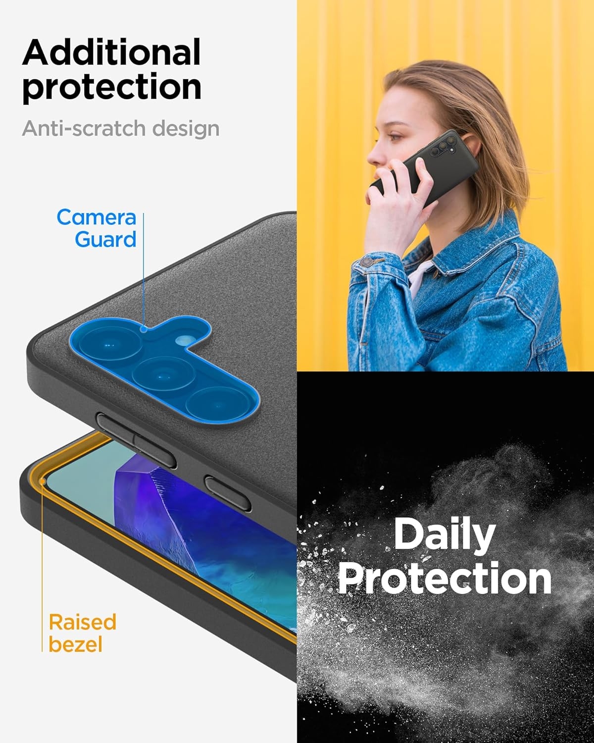 Το εξαιρετικό χαρακτηριστικό της θήκης είναι η μοναδική υφή άμμου που προσφέρει μια κομψή εμφάνιση, αλλά και ένα εξαιρετικό κράτημα, μειώνοντας τον κίνδυνο των τυχαίων πτώσεων. Το υπερυψωμένο πλαίσιο προσφέρουν επιπλέον προστασία για την οθόνη και τους φακούς, προφυλάσσοντάς τα από γρατσουνιές και άλλες φθορές.