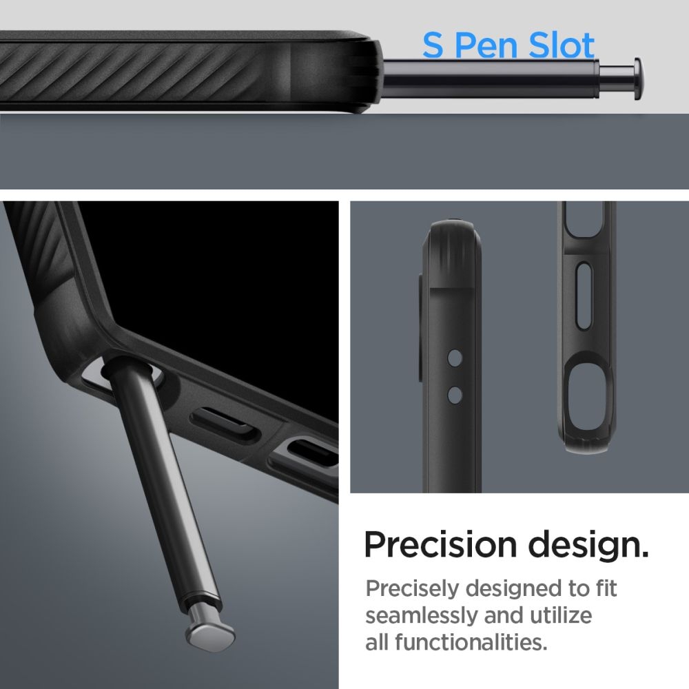 Η θήκη Rugged Armor της Spigen είναι κατασκευασμένη για να εφαρμόζει τέλεια στο Samsung Galaxy S24 Ultra και να το προστατεύει από την καθημερινή χρήση, αποτελεσματικά, χωρίς να προσθέτει επιπλέον όγκο στη συσκευή σας.