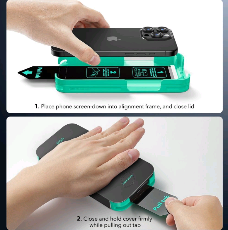 Η συσκευασία περιλαμβάνει: 1 x Tempered glass ESR Armorite, 1 x Kit τοποθέτησης, 1 x Πλαίσιο εγκατάστασης.