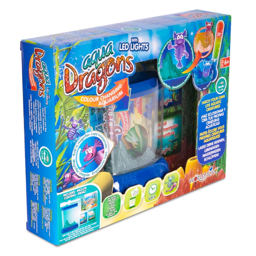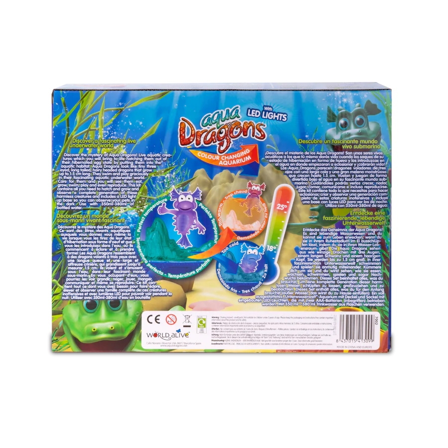 Το μοναδικό έξυπνο ενυδρείο των Aqua Dragons, αλλάζει χρώμα ώστε να σας δείχνει κάθε φορά αν η θερμοκρασία του νερού είναι η σωστή. Αν το παγόβουνο είναι μπλε τότε το νερό είναι πολύ κρύο για τους Aqua Dragons σας! Αν το παγόβουνο είναι κόκκινο το νερό είναι πολύ ζεστό! Αν το παγόβουνο είναι πράσινο το νερό είναι στην ιδανική θερμοκρασία για τους «Υδροδράκους» σας ώστε να αναπτυχθούν σωστά! Ο ενσωματωμένος μεγεθυντικός φακός σας δίνει μια καλύτερη ματιά, με φωτισμό LED για να ζωντανέψετε τους Aqua Dragons σας τη νύχτα.