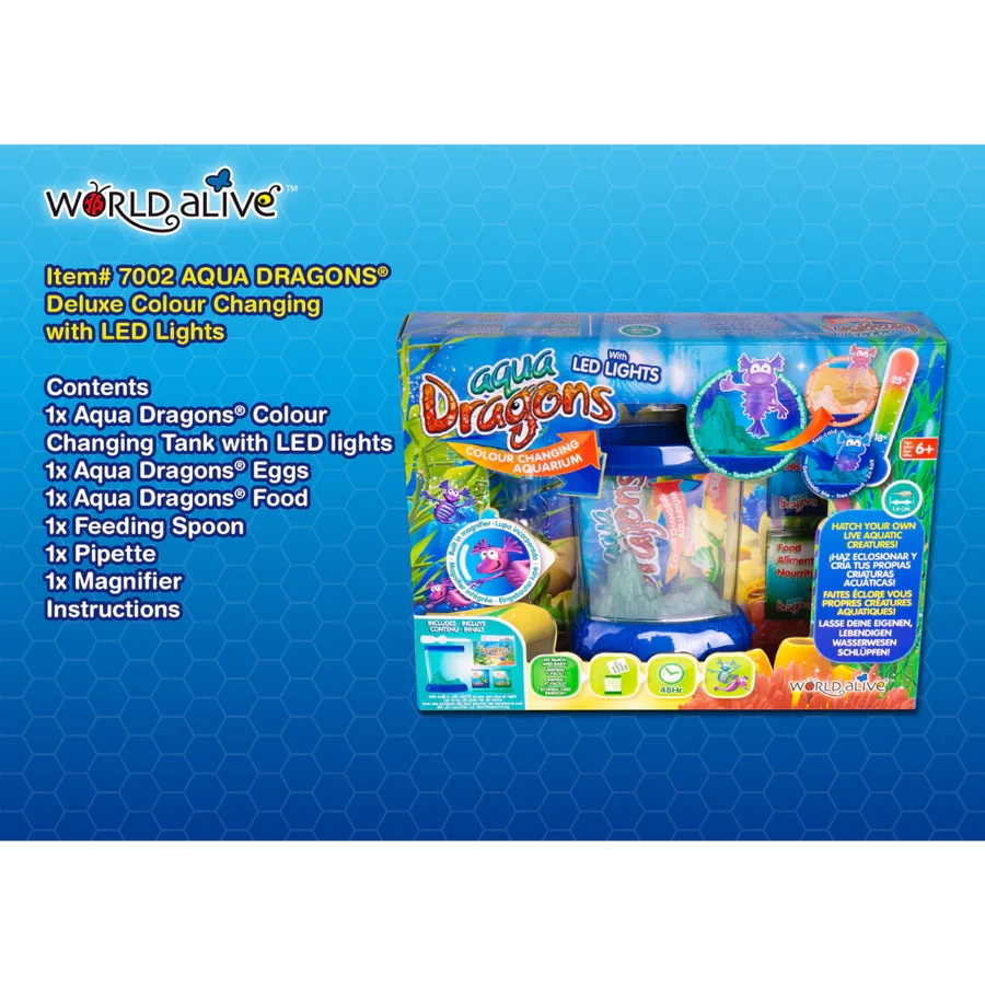 Η συσκευασία περιλαμβάνει: 1 x Ενυδρείο LED με ενσωματωμένο μεγεθυντικό φακό, 2 x Μπαταρίες AAA, 1 x Αυγά Aqua Dragons, 1 x Τροφή για Aqua Dragons, 1 x Κουτάλι ταΐσματος, 1 x Σταγονόμετρο, 1 x Οδηγίες Χρήσης.
