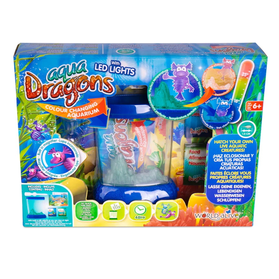 Τα Aqua Dragons είναι υδρόβια πλασματάκια, με την επιστημονική ονομασία ‘Artemia Salina’ που μπορούν να εκκολαφθούν και να αναπτυχθούν στο σπίτι. Απλά προσθέτετε νερό και οι «Υδροδράκοντες» εκκολάπτονται ως εκ θαύματος σε μόνο 2-3 ημέρες. Μπορούν να φτάσουν μέχρι και το 1.5 εκατοστό σε μήκος. Φροντίστε τα, ταΐστε τα κάθε 2 με 3 ημέρες και παρατηρήστε τα να τρέφονται, να μεγαλώνουν, να παίζουν, να κολυμπούν ακόμα και να αναπαράγονται!