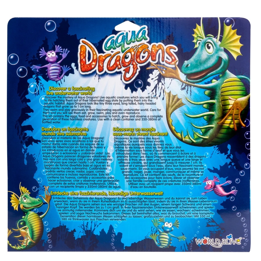 Τα Aqua Dragons είναι υδρόβια πλασματάκια, με την επιστημονική ονομασία ‘Artemia Salina’ που μπορούν να εκκολαφθούν και να αναπτυχθούν στο σπίτι. Απλά προσθέτετε νερό και οι «Υδροδράκοντες» εκκολάπτονται ως εκ θαύματος σε μόνο 2-3 ημέρες. Μπορούν να φτάσουν μέχρι και το 1 εκατοστό σε μήκος. Φροντίστε τα, ταΐστε τα κάθε 2 με 3 ημέρες και παρατηρήστε τα να τρέφονται, να μεγαλώνουν, να παίζουν, να κολυμπούν ακόμα και να αναπαράγονται!