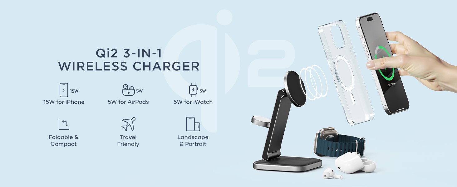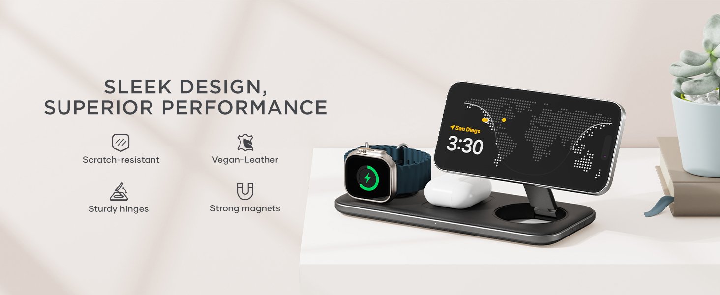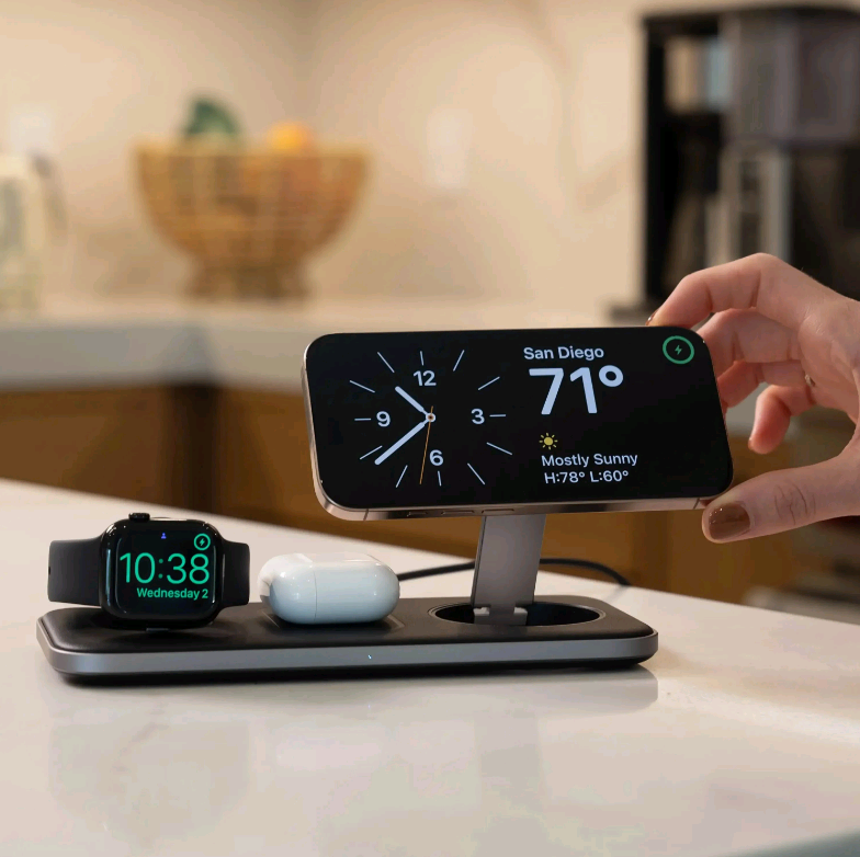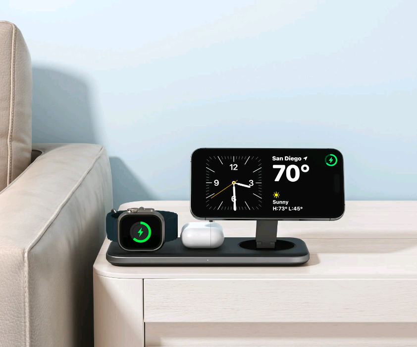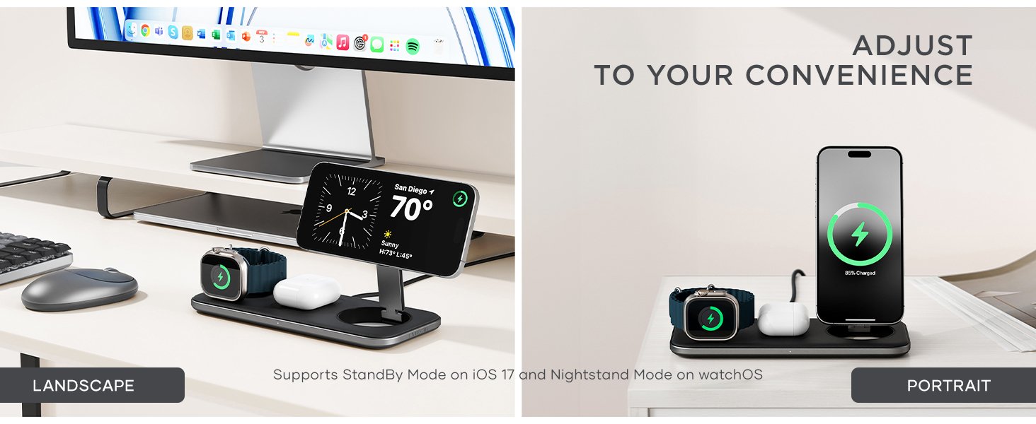 Αυτή η μαγνητική βάση ασύρματης φόρτισης θα σας βοηθήσει να οργανώσετε την επιφάνεια εργασίας σας και να φορτίζετε και τις τρεις συσκευές σας ταυτόχρονα! Επίσης, σας επιτρέπει να στηρίξετε το τηλέφωνό σας σε όρθια θέση ή να το τοποθετήσετε επίπεδα, προσαρμόζοντας τη φόρτιση στις ανάγκες σας.