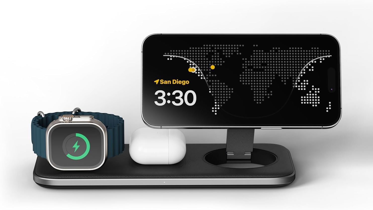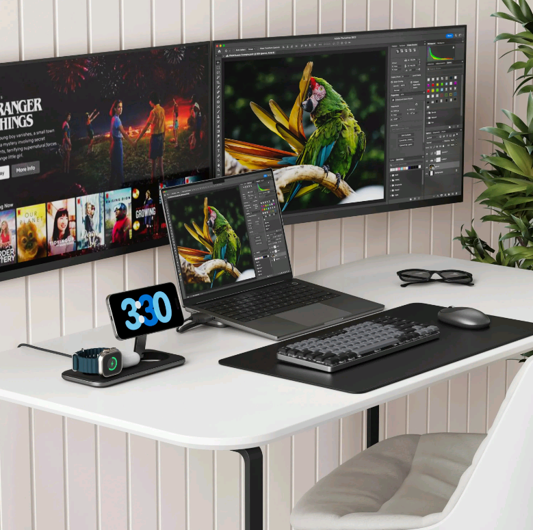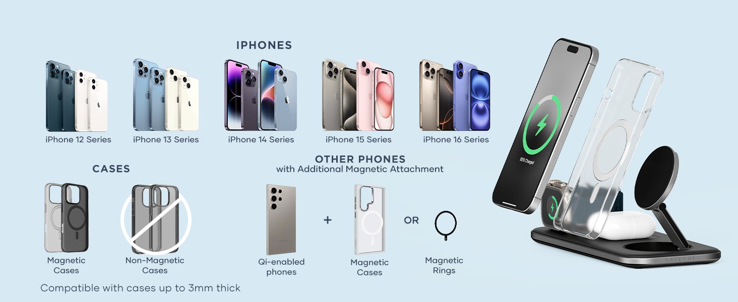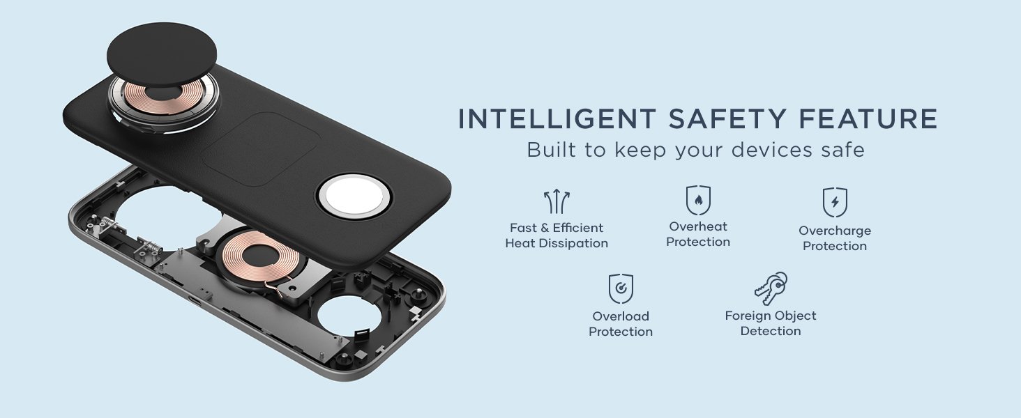 Αυτή η μαγνητική βάση ασύρματης φόρτισης θα σας βοηθήσει να οργανώσετε την επιφάνεια εργασίας σας και να φορτίζετε και τις τρεις συσκευές σας ταυτόχρονα! Επίσης, σας επιτρέπει να στηρίξετε το τηλέφωνό σας σε όρθια θέση ή να το τοποθετήσετε επίπεδα, προσαρμόζοντας τη φόρτιση στις ανάγκες σας.