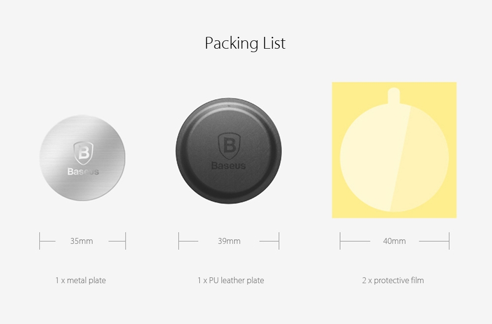 Η συσκευασία περιλαμβάνει 2 μαγνητικές πλάκες και προστατευτική μεμβράνη, η οποία χρησιμοποιείται για να μην γρατζουνιέται η συσκευή σας. Το ένα αυτοκόλλητο έχει δερμάτινη επένδυση σε περίπτωση που θέλετε να το τοποθετήσετε πάνω στη θήκη του κινητού σας, ώστε να σας προσφέρει κομψότητα.