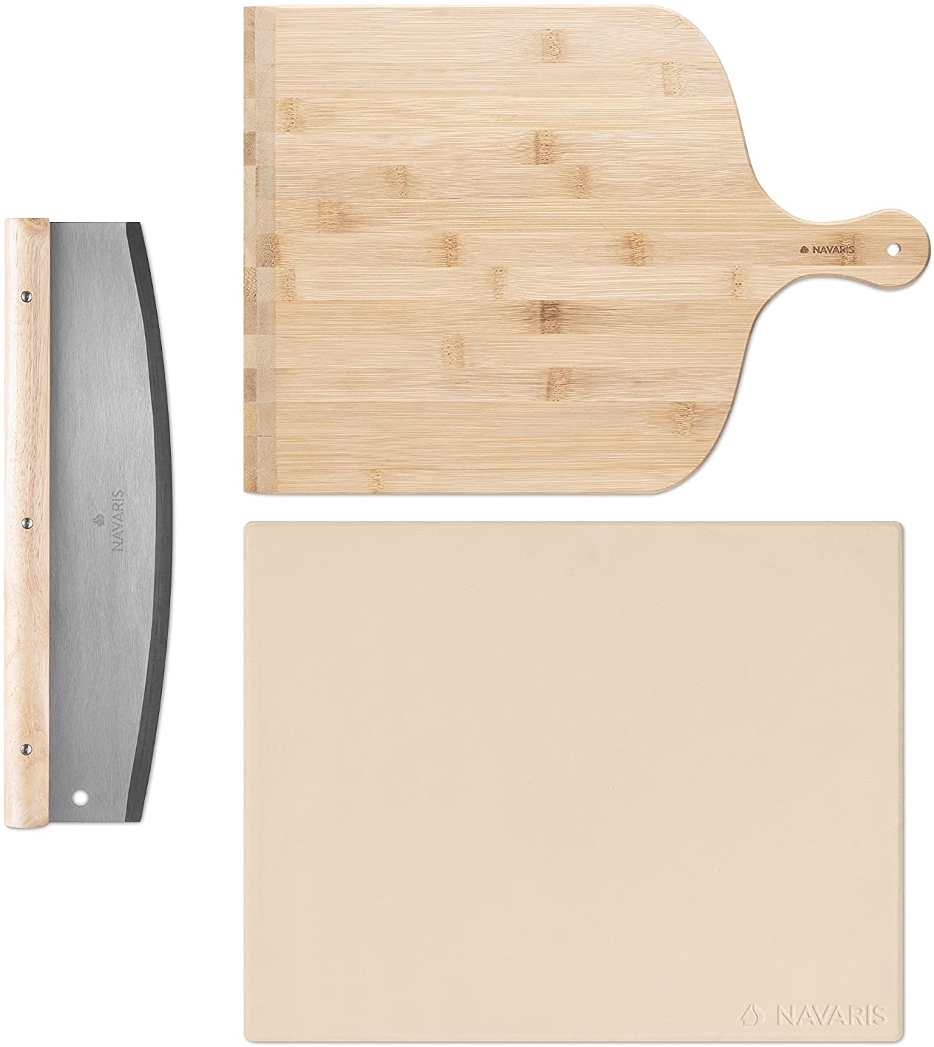 Επίσης για να ολοκληρώσετε την εμπειρία ψησίματος της αγαπημένης σας πίτσας, περιλαμβάνεται ένα φτυάρι από Bamboo για την πίτσα, ώστε να μπορείτε να σηκώνετε και να μεταφέρετε εύκολα τις ψημένες σας ζύμες από την πέτρα στο τραπέζι σας και το μαχαίρι Mezzaluna, ένα πρακτικό μαχαίρι με κοφτερή και ανθεκτική λεπίδα από ανοξείδωτο ατσάλι, κατάλληλο για την κοπή της πίτσας σας, αλλά και για την κοπή βοτάνων ή λαχανικών.