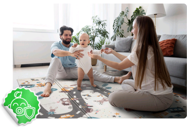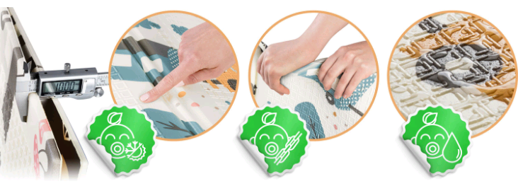 Το χαλάκι αυτό είναι ιδανικό την ασφάλεια των παιδιών, καθώς δεν περιέχει δισφαινόλη Α (BPA), PVC, φθαλικές ενώσεις ή φορμαμίδιο. Πληροί τα αυστηρά ευρωπαϊκά πρότυπα ασφαλείας, ενώ διαθέτει το Ευρωπαϊκό Πιστοποιητικό CE και έχει περάσει τις δοκιμές EN71-1, EN71-2 και EN71-3. Είναι επίσης τέλειο για παιδιά με ευαισθησίες ή αλλεργίες, καθώς δεν μαζεύει σκόνη ή ακάρεα.