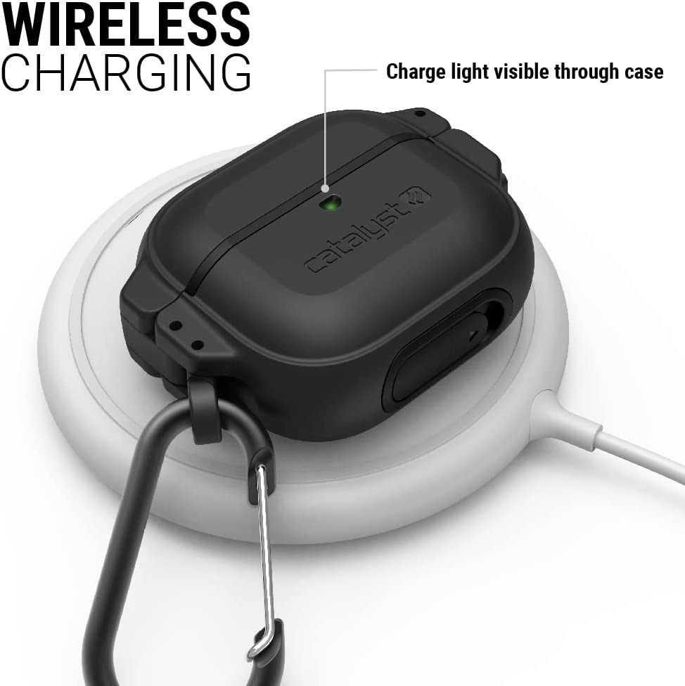 Σας παρέχει επίσης άμεση πρόσβαση στην υποδοχή Lightning για να φορτίζετε τα ακουστικά σας, χωρίς να χρειάζεται να αφαιρείτε τη θήκη, παράλληλα είναι συμβατή με την ασύρματη φόρτιση. Συμπεριλαμβάνεται επίσης στη θήκη ένα ειδικό καραμπινέρ - μπρελόκ, το οποίο σας προσφέρει τη δυνατότητα να εφαρμόζετε τη θήκη σε οποιοδήποτε σακίδιο, τσάντα ή όπου αλλού επιθυμείτε. Με το τρόπο αυτό θα έχετε παντού μαζί σας τα ακουστικά, χωρίς να φοβάστε μήπως χαθούν.