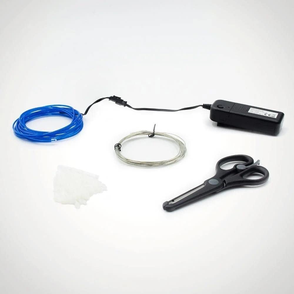 Η συσκευασία περιλαμβάνει: 1 x 3μετρο νεον μπλε σύρμα, 1 x Mεταλλικό σύρμα που λυγίζει, 1 x Θήκη για μπαταρίες, 1 x Ψαλίδι, Τάιραπ.