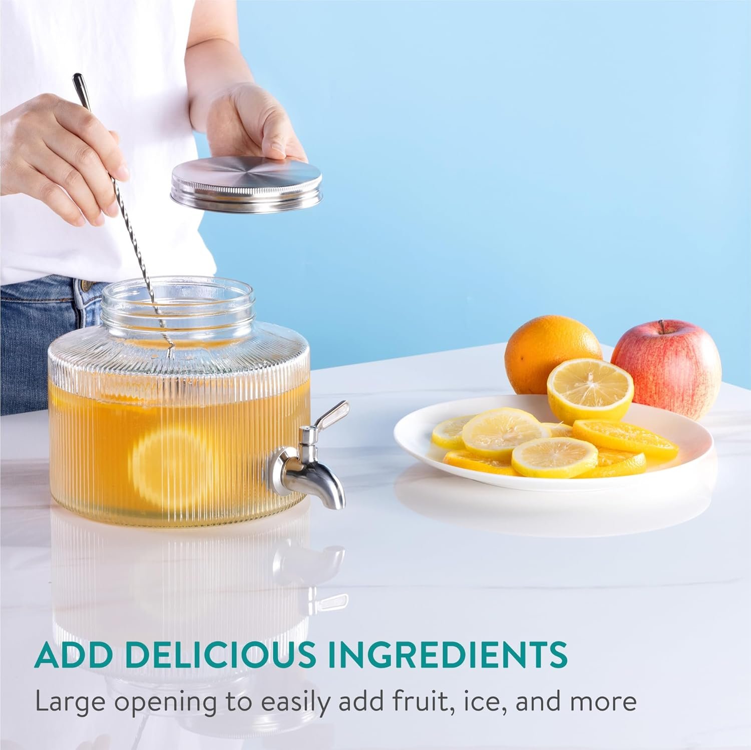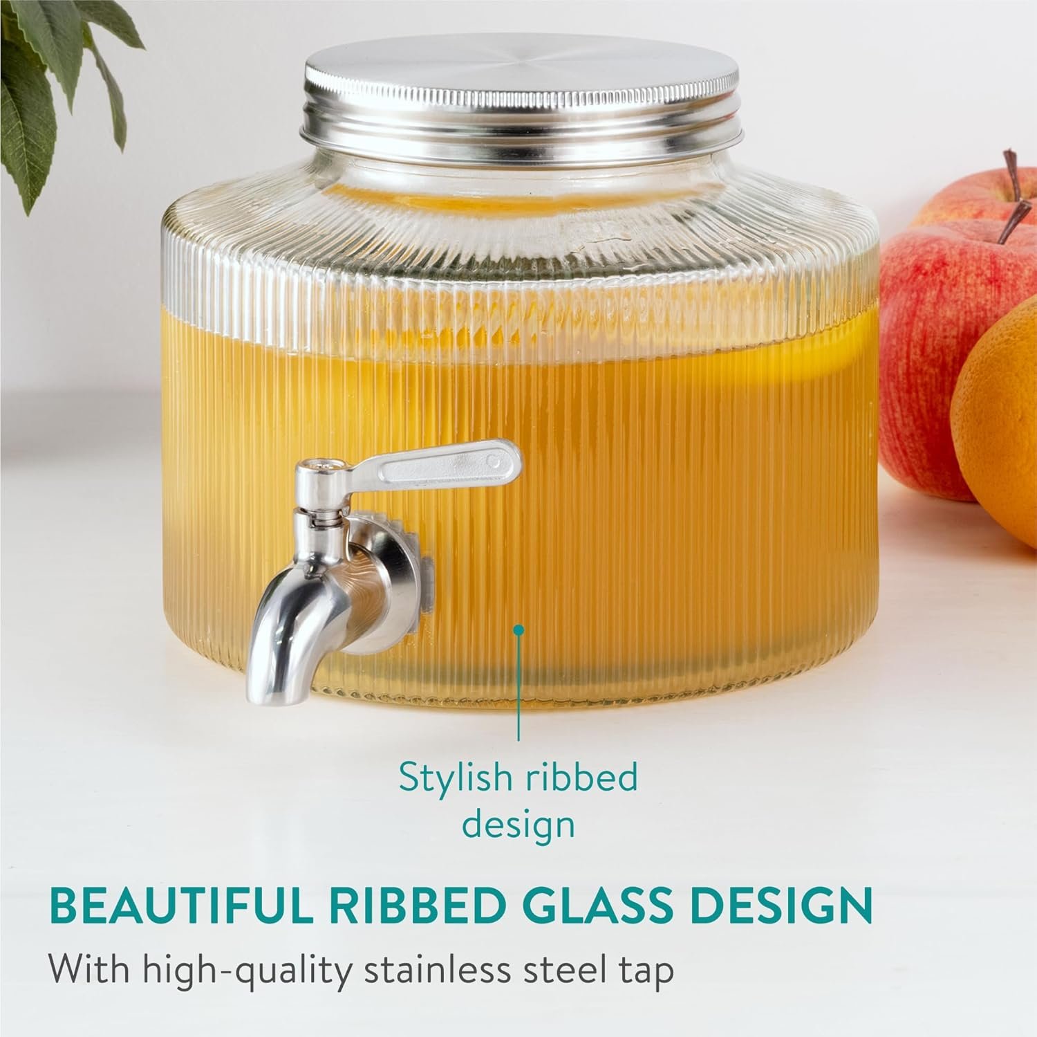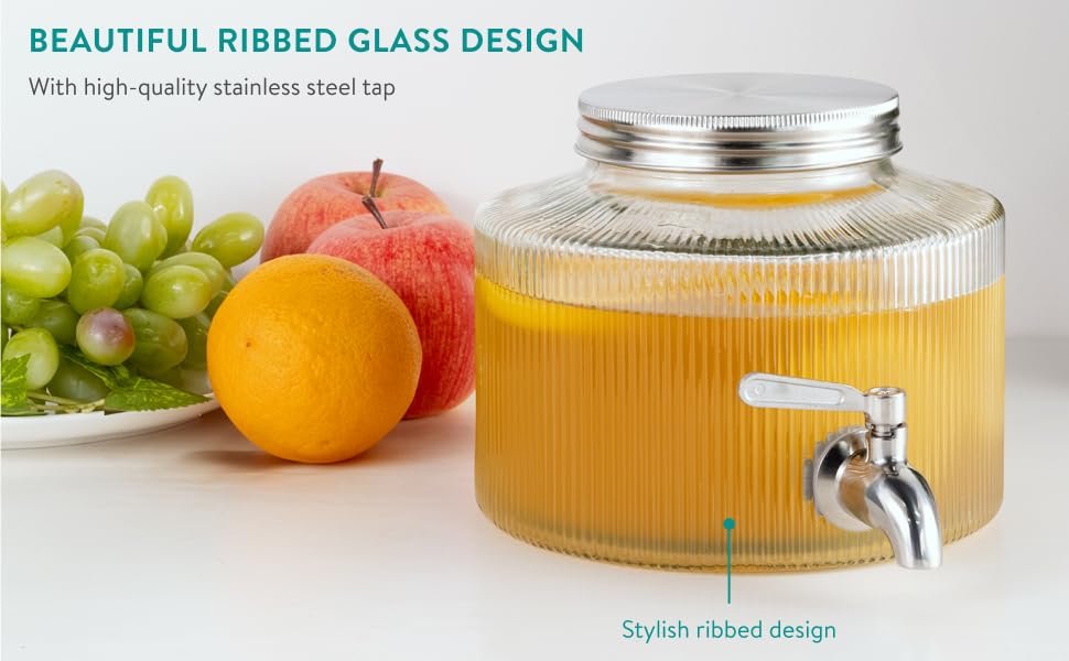 Διαθέτει ένα κομψό ραβδωτό σχεδιασμό το οποίο θα ταιριάξει σε κάθε κουζίνα ή οποιοδήποτε χώρο στο σπίτι σας, ενώ η χωρητικότητα 2.7 λίτρων, σας επιτρέπει να προσφέρετε όλα τα αγαπημένα σας δροσερά ροφήματα. Με στιβαρή κατασκευή από παχύ, ανθεκτικό γυαλί σόδα-λάιμ, σας προσφέρει διαφάνεια και ανθεκτικότητα.