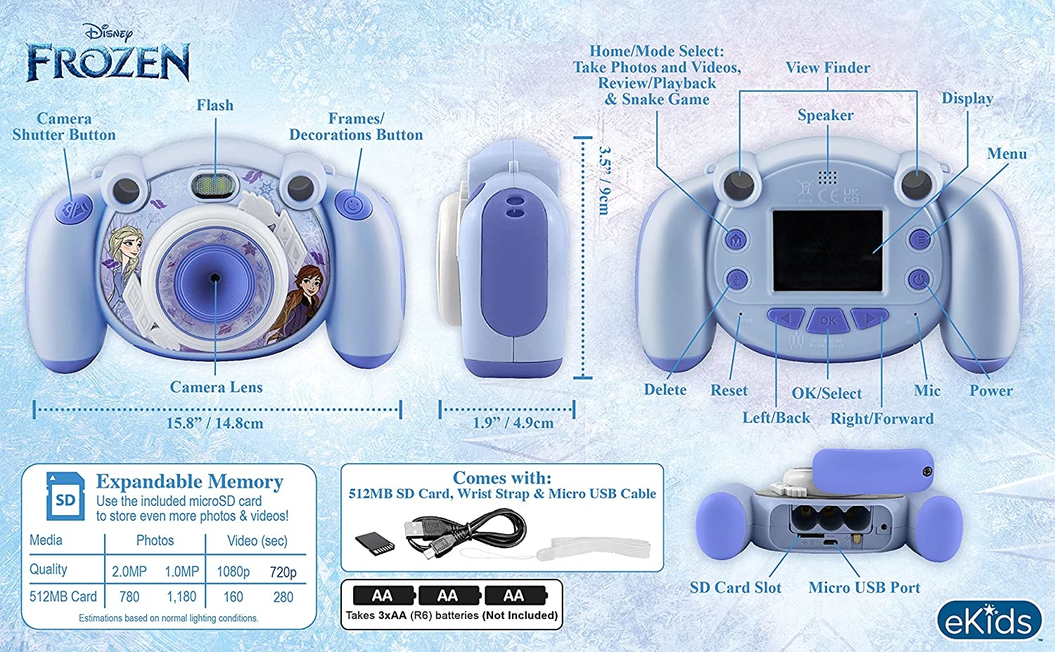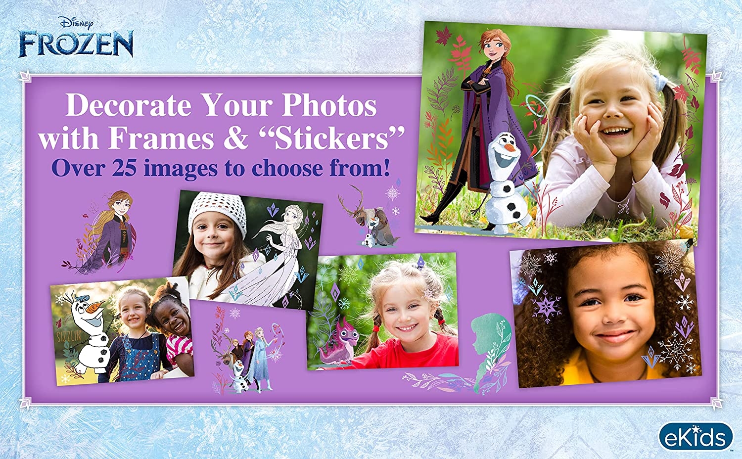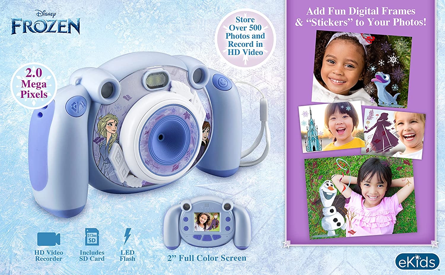 Τα παιδιά παίζουν και μαθαίνουν με την πρώτη τους φωτογραφική μηχανή της eKids, η οποία έρχεται με official license από το franchise «Frozen». Έχει σχεδιαστεί για τις ανάγκες των μικρών μας φωτογράφων, βγάζει φωτογραφίες και σας δίνει τη δυνατότητα να προσθέσετε stickers!