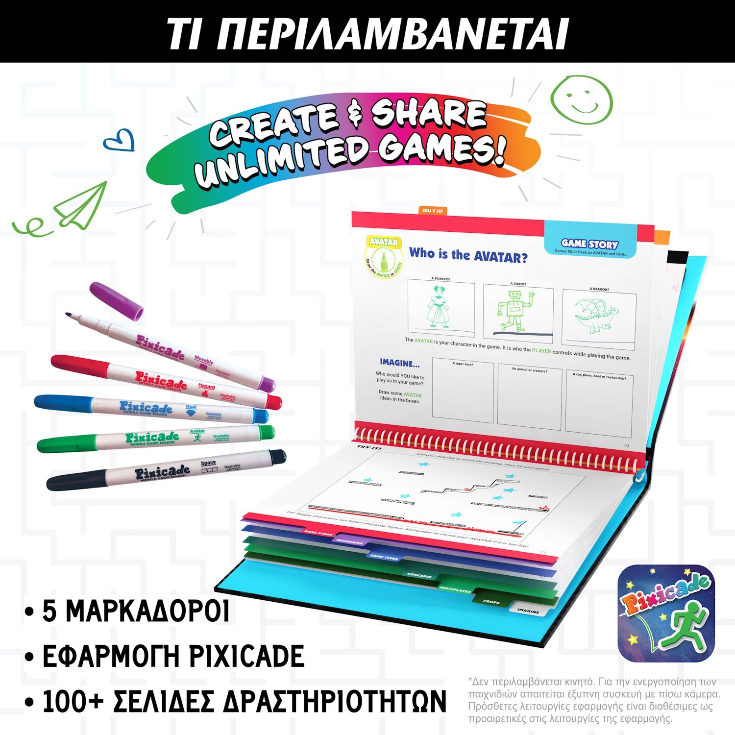 Η συσκευασία περιλαμβάνει: 3 x Βιβλία δραστηριοτήτων που διδάσκουν σχεδιασμό παιχνιδιών, 5 x Μαρκαδόροι, 1 x Κωδικός για ξεκλείδωμα της εφαρμογής σε μία συσκευή και δημιουργία απεριόριστων παιχνιδιών, 1 x Επιπλέον κωδικός για ξεκλείδωμα της εφαρμογής σε δεύτερη συσκευή και δημιουργία απεριόριστων παιχνιδιών. Γλώσσα βιβλίου: Ελληνικά, Γλώσσα εφαρμογής: Ελληνικά & Αγγλικά, Οδηγίες/Οδηγός Γρήγορης Εκκίνησης