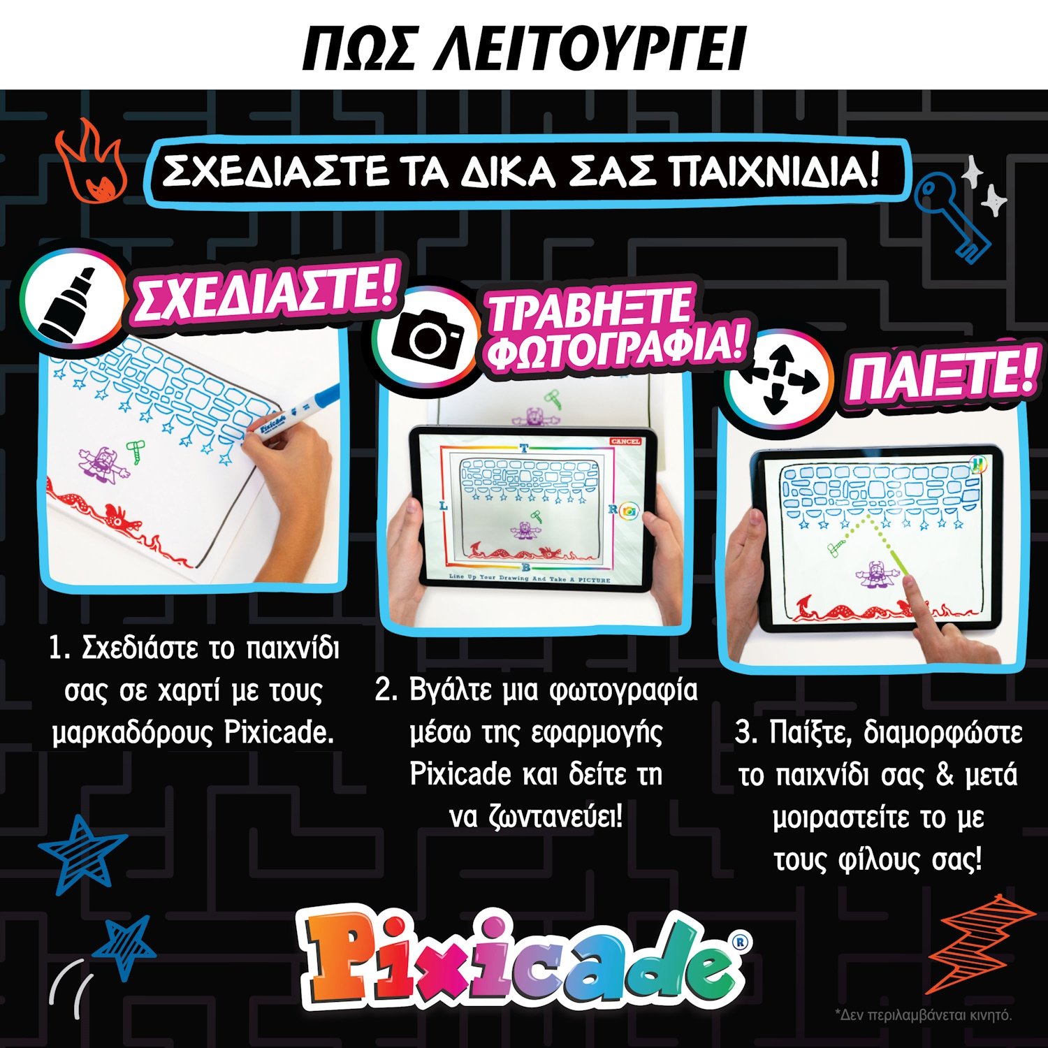 Σχεδιάστε τα αγαπημένα σας παιχνίδια σε χαρτί με τους ειδικούς μαρκαδόρους Pixicade, τραβήξτε μια φωτογραφία μέσω της εφαρμογής και παρακολουθήστε τα σχέδιά σας να ζωντανεύουν μπροστά στα μάτια σας, με τους χαρακτήρες και τα επίπεδα να μετατρέπονται σε πραγματικά βιντεοπαιχνίδια που μπορείτε να παίξετε άμεσα στην οθόνη του κινητού ή του tablet σας!