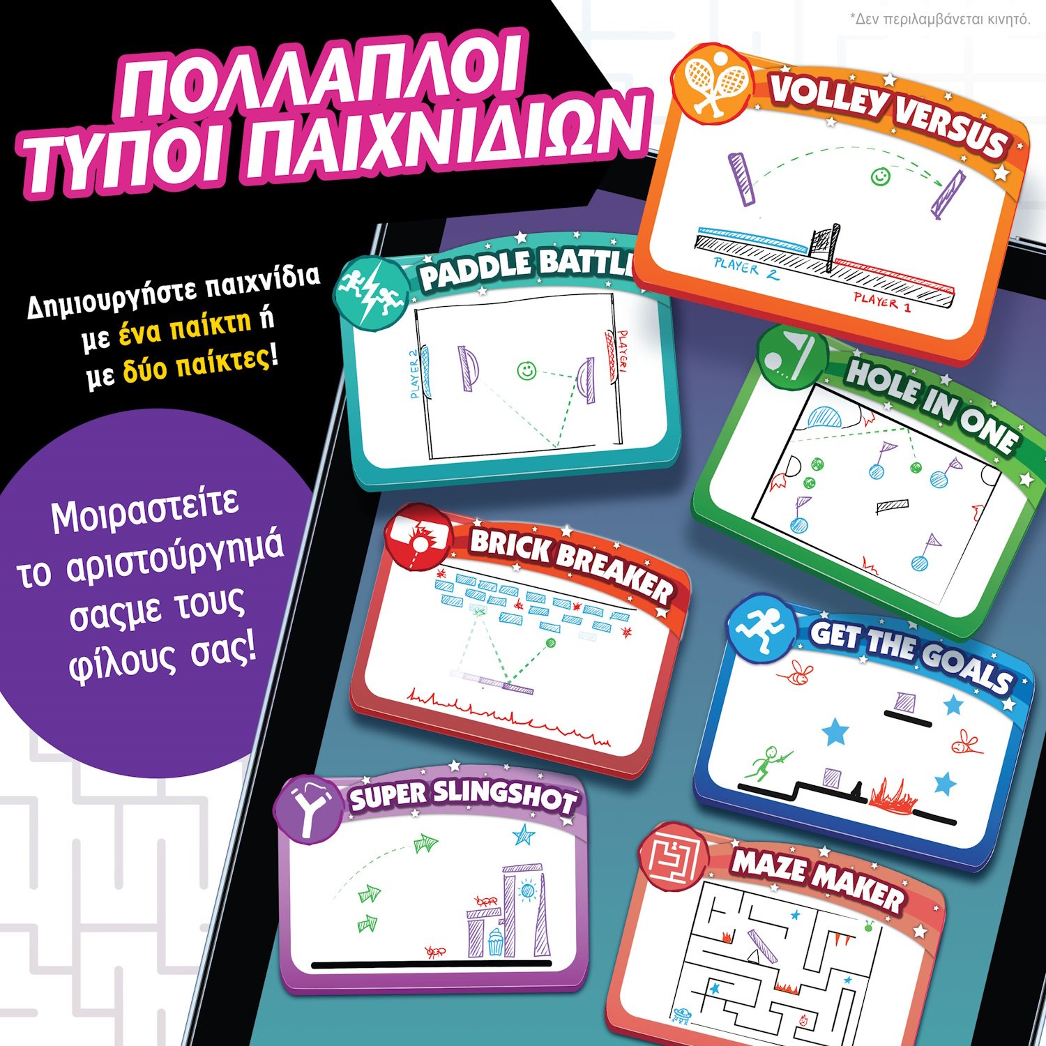 Φτιάξτε παιχνίδια για έναν ή και δύο παίκτες και μοιραστείτε το αριστούργημά σας με τους φίλους σας ή με την οικογένειά σας. Η δυνατότητα να σχεδιάσετε το δικό σας παιχνίδι με μοναδικούς χαρακτήρες, εμπόδια και στόχους, μετατρέπει κάθε σχέδιο σε ένα συναρπαστικό παιχνίδι.