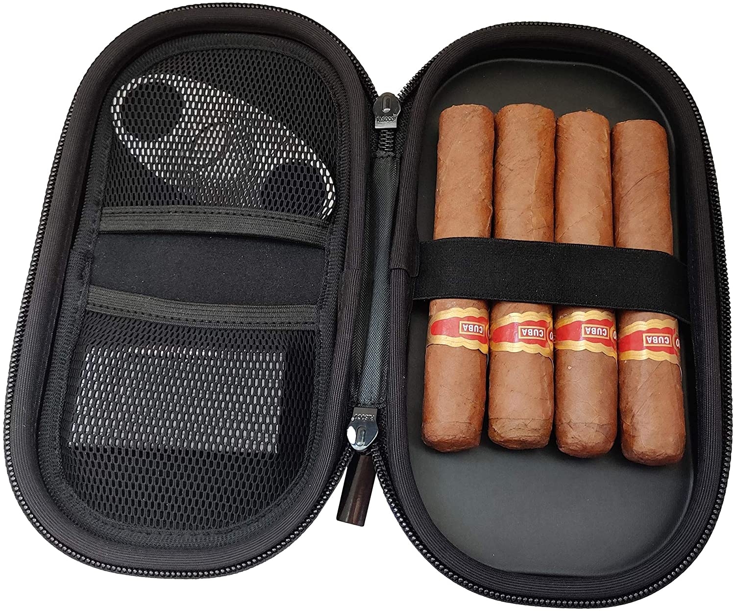 Στο εσωτερικό της αυτή η θήκη περιλαμβάνει επιπλέον χώρο για να έχετε μαζί σας οργανωμένα, τον κόφτη πούρων σας και έναν αναπτήρα. Χάρη στο σκληρό της κάλυμμα, με φερμουάρ δύο κατευθύνσεων είναι ανθεκτική και πρακτική. Επιπλέον είναι κατασκευασμένη από αδιάβροχο υλικό, χωρίς ξύλινα υλικά για την πρόληψη της μούχλας.