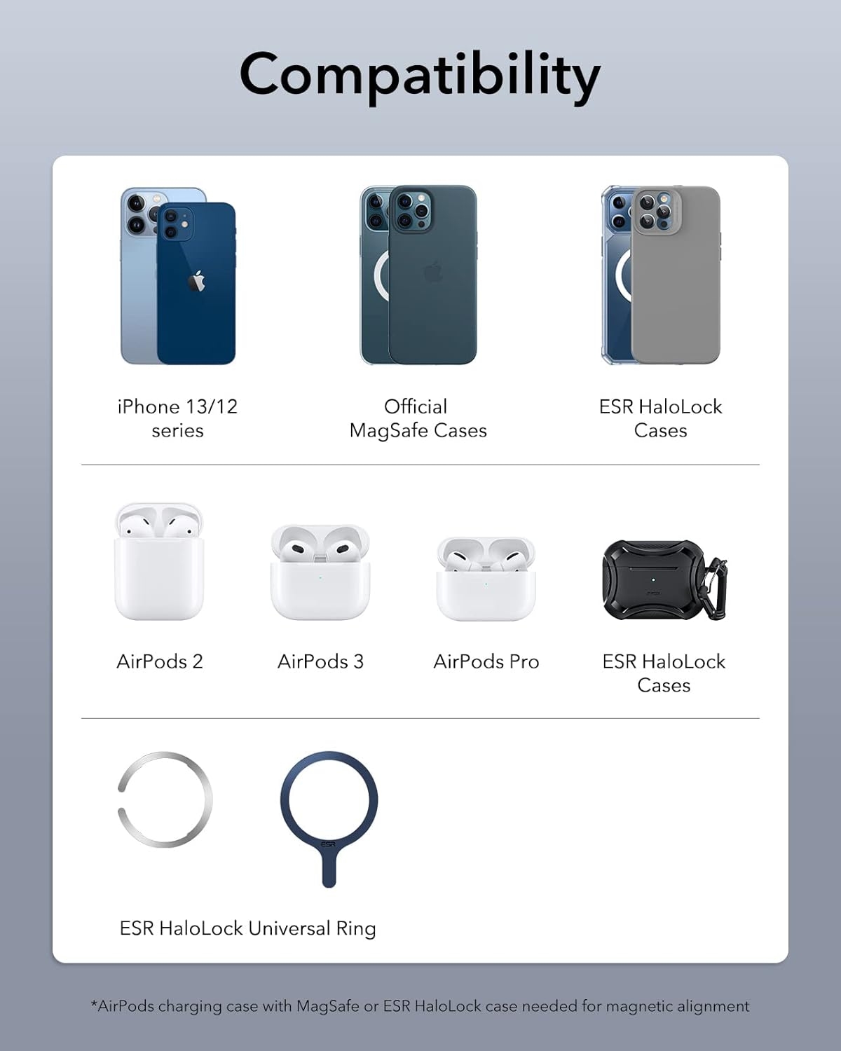 Σημείωση: Η βάση είναι συμβατή με όλα τα iPhone που διαθέτουν MagSafe, με θήκες MagSafe και HaloLock™, το HaloLock™ Universal Ring και με τα AirPods Pro/3/2. Η γρήγορη φόρτιση CryoBoost δεν υποστηρίζεται στη λειτουργία φόρτισης χωρίς φως.