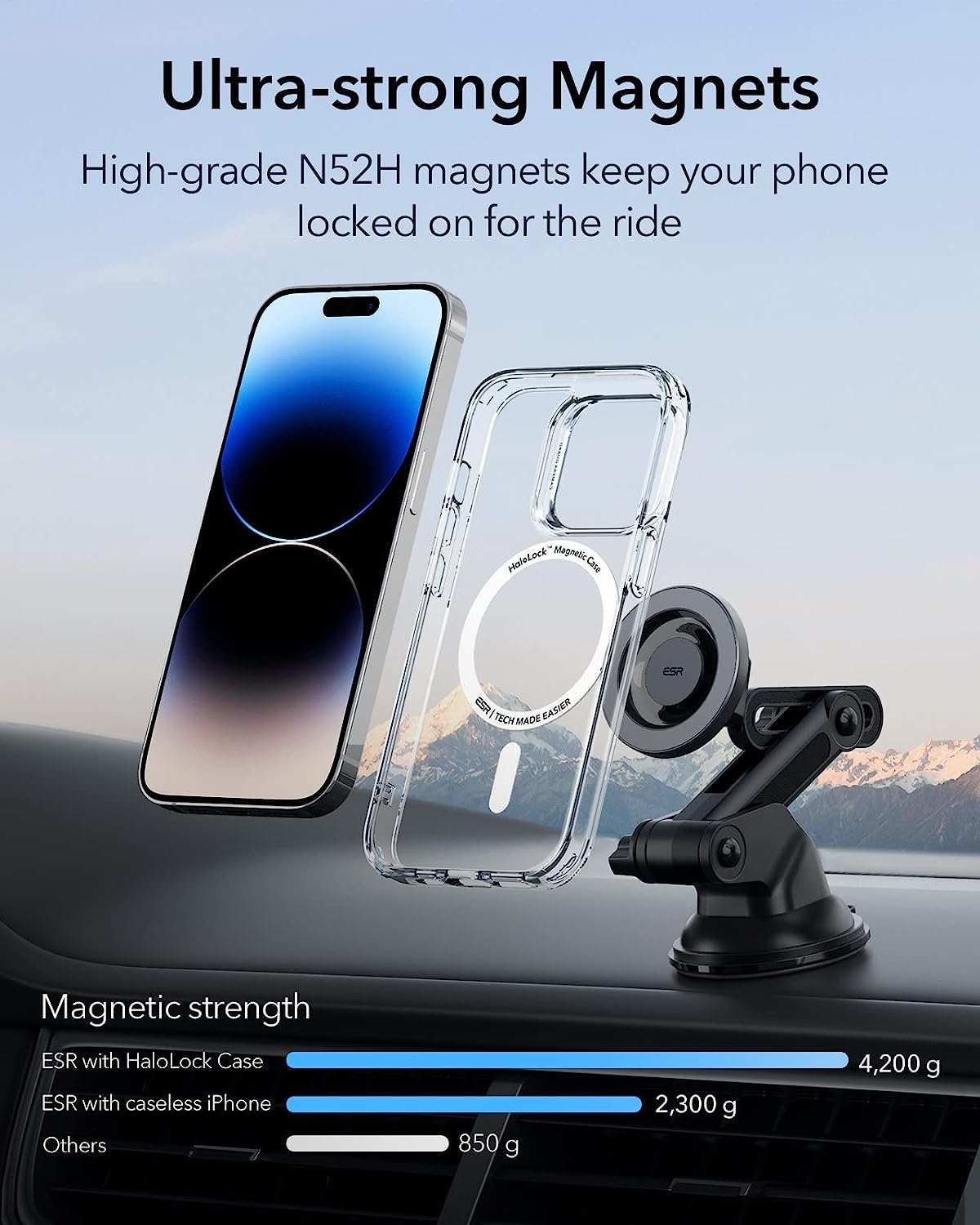 Επιπλέον, ο μαγνητικός δακτύλιος είναι ανθεκτικός στη θερμότητα, πράγμα που σημαίνει ότι το τηλέφωνό σας δεν θα υπερθερμαίνεται στα μεγάλα ταξίδια, ενώ οι μαγνήτες με δύναμη συγκράτησης 2.300 g κρατούν το τηλέφωνό σας με ασφάλεια.