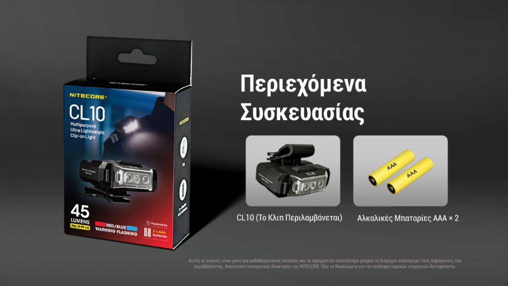 Η συσκευασία περιλαμβάνει: 1 x Φακός με Κλιπ CL10, 2 x Μπαταρίες AAA.