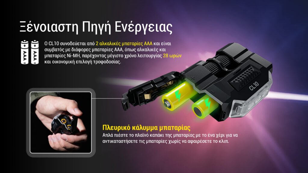 Ο CL10 συνοδεύεται από 2 αλκαλικές μπαταρίες AAA και είναι συμβατός με διάφορες μπαταρίες AAA, όπως αλκαλικές και μπαταρίες Ni-MH, παρέχοντας μέγιστο χρόνο λειτουργίας 28 ωρών και οικονομική επιλογή τροφοδοσίας. Χάρη στο πλευρικό κάλυμμα, η αντικατάσταση των μπαταριών γίνεται εύκολα και γρήγορα με το ένα χέρι, απλά πιέστε το πλαϊνό καπάκι της μπαταρίας χωρίς να αφαιρέσετε το κλιπ.