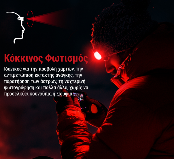 Είναι ο ιδανικός σύντροφος για τις υπαίθριες σας δραστηριότητες τη νύχτα, στη πεζοπορία, περιπέτειες στην ύπαιθρο, στο νυχτερινό τρέξιμο και στο κάμπινγκ. Ο βοηθητικός κόκκινος φωτισμός διατηρεί αποτελεσματικά τη νυχτερινή όραση, δεν προσελκύει τα κουνούπια και τα έντομα, βοηθά στην παρατήρηση των αστεριών, λειτουργεί ως προειδοποίηση ασφαλείας, αντιμετώπιση έκτακτης ανάγκης και πολλά άλλα.