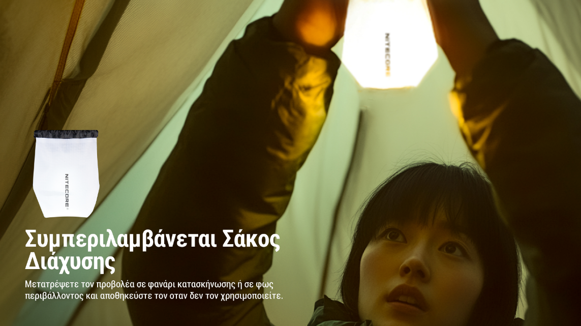Είναι επίσης κατασκευασμένο από ανθεκτικό υλικό PC για εξαιρετική αντοχή σε χτυπήματα και χαμηλές θερμοκρασίες. Τέλος, περιλαμβάνεται ένας ειδικός σάκος για την διάχυση του φωτισμού, με τον οποίο μπορείτε να μετατρέψετε τον φακό σε φανάρι κατασκήνωσης ή σε φωτιστικό περιβάλλοντος και να τον αποθηκεύετε όταν δεν χρησιμοποιείται!