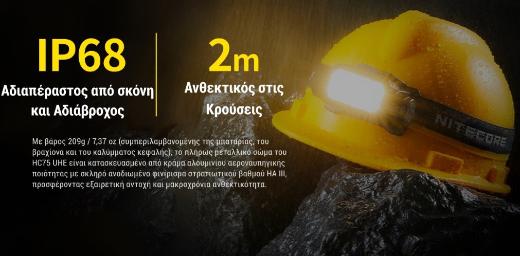 Είναι ελαφρύ και ανθεκτικό, ζυγίζοντας μόλις 209 γραμμάρια, μαζί με τη μπαταρία, τον βραχίονα και το κάλυμμα κεφαλής, το HC75 UHE διαθέτει πλήρως μεταλλικό σώμα κατασκευασμένο από κράμα αλουμινίου αεροναυπηγικής ποιότητας, με σκληρό ανοδιωμένο φινίρισμα στρατιωτικών προδιαγραφών (HA III), προσφέροντας εξαιρετική αντοχή στη φθορά και μακροχρόνια χρήση.