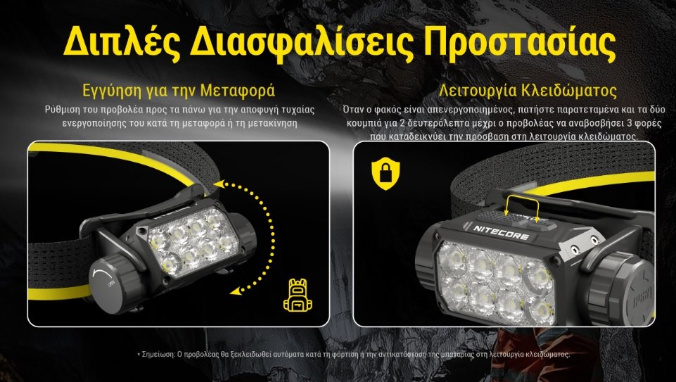 Σχεδιασμένος με διπλές διασφαλίσεις προστασίας, για ασφάλεια κατά τη μεταφορά ή τη μετακίνηση. Η ρύθμιση του φακού προς τα πάνω αποτρέπει την τυχαία ενεργοποίησή του, διασφαλίζοντας τη μέγιστη ασφάλεια. Επιπλέον, με τη λειτουργία κλειδώματος, όταν ο φακός είναι απενεργοποιημένος, πατήστε παρατεταμένα και τα δύο κουμπιά για 2 δευτερόλεπτα μέχρι να αναβοσβήσει 3 φορές, έτσι σας δείχνει ότι η λειτουργία κλειδώματος είναι ενεργοποιημένη.