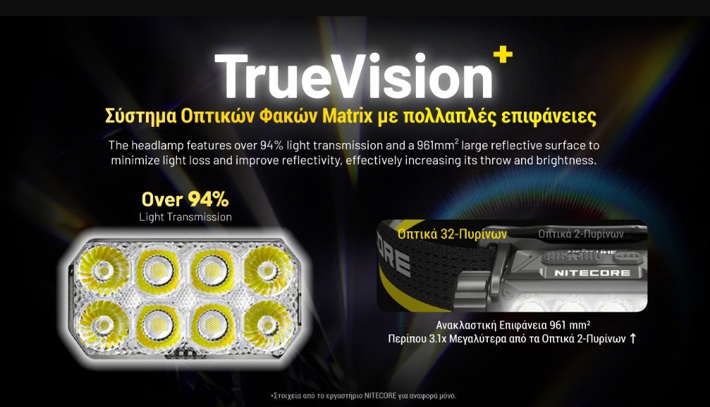 Είναι εξοπλισμένο με 8 τετραπύρηνα LED UHE, τοποθετημένα σε πλέγμα, για να μεγιστοποιείται η φωτεινή απόδοση και οι επιδόσεις. True Vision+, είναι το σύστημα οπτικών φακών Matrix με πολλαπλές επιφάνειες. Ο φακός διαθέτει μετάδοση φωτός πάνω από 94%, με ανακλαστική επιφάνεια 961 τετραγωνικών μέτρων, η εμβέλεια και η φωτεινότητά του ενισχύονται σημαντικά.