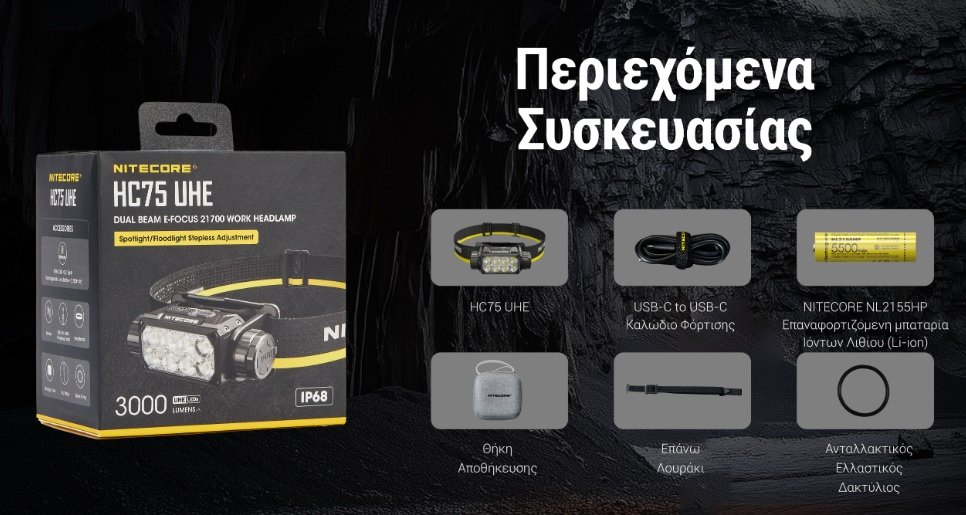 Η συσκευασία περιλαμβάνει: 1 x HC75 UHE, 1 x Καλώδιο φόρτισης Type-C σε Type-C, 1 x Nitecore NL2155HP Επαναφορτιζόμενη Μπαταρία Ιόντων Λιθίου Li-ion 5.500mAh, 1 x Θήκη Αποθήκευσης, 1 x Επάνω Λουράκι, 1 x Ανταλλακτικός Ελαστικός Δακτύλιος.
