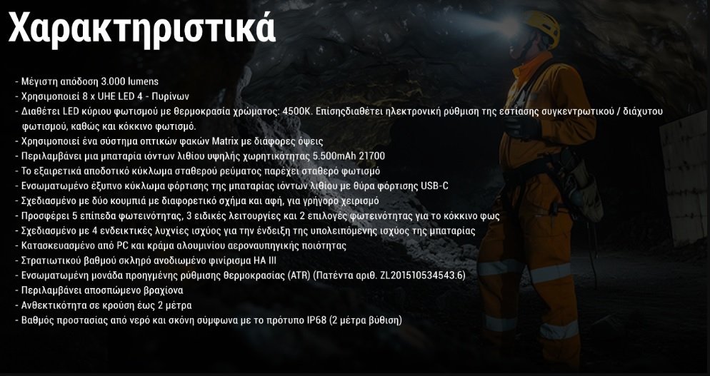 Σας εξασφαλίζει έως 84 ώρες λειτουργίας στο πολύ χαμηλό (40 lumens), στο χαμηλό 200 lumens έως 32 ώρες, στο μεσαίο 600 lumens με έως 12 ώρες, στο υψηλό 1.500 lumens με έως 7 ώρες και 15 λεπτά ενώ στο turbo 3.000 lumens έως 4 ώρες και 30 λεπτά. Επαναφορτίζεται πλήρως σε περίπου 2 ώρες και 10 λεπτά με τη χρήση προσαρμογέα 9V/2A, ενώ διαθέτει εσωτερικά αδιάβροχη θύρα με προστατευτικό κάλυμμα, που προσφέρει αποτελεσματική αντοχή στο νερό και στις κρούσεις.