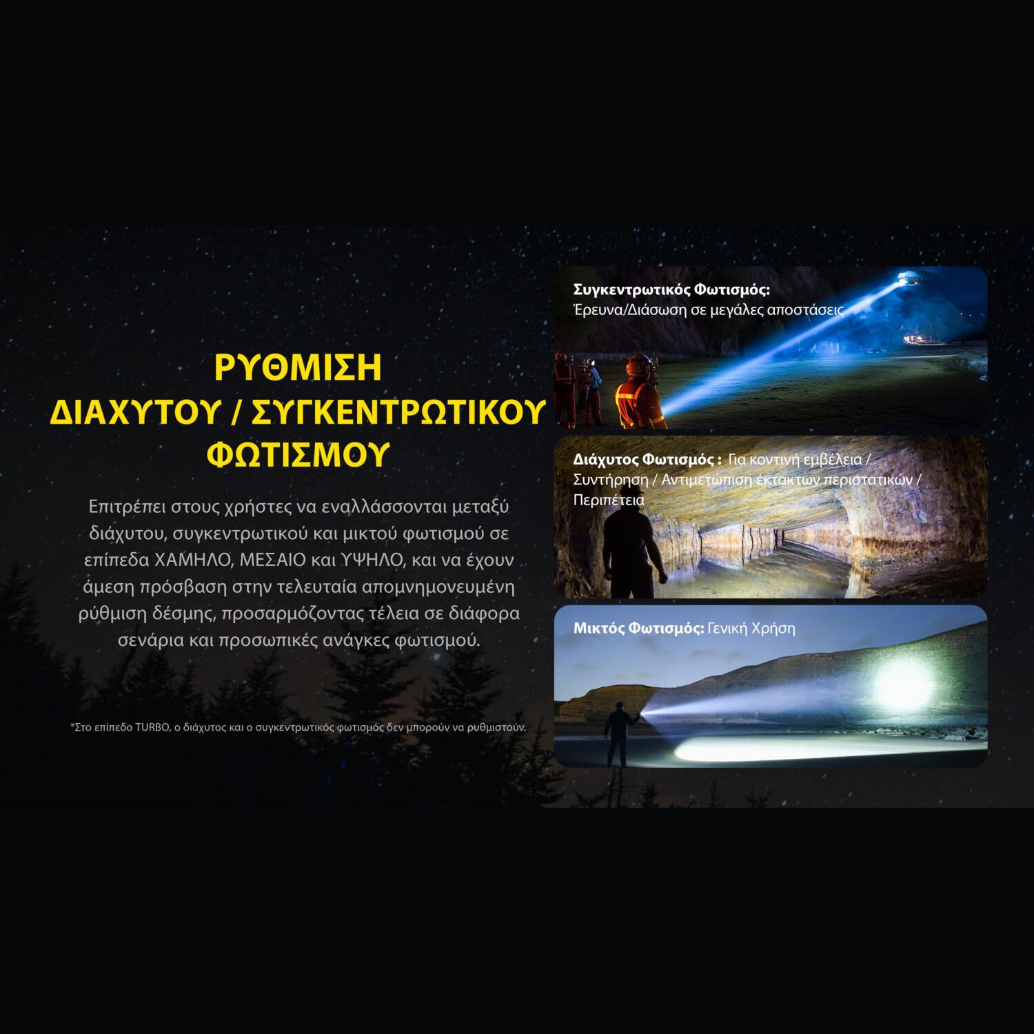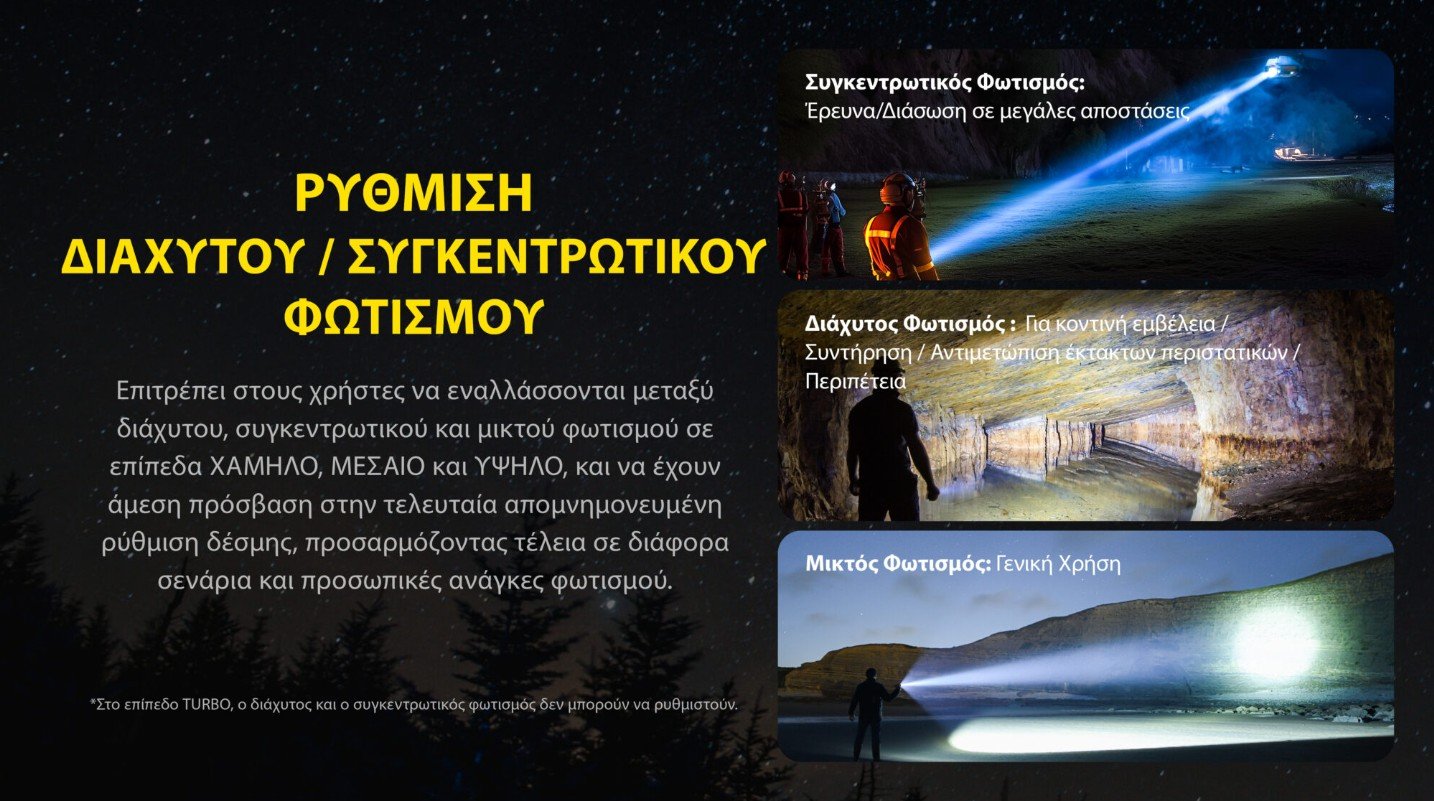 Η ρύθμιση διάχυτου και συγκεντρωτικού φωτισμού, επιτρέπει στους χρήστες να εναλλάσσονται μεταξύ διάχυτου, συγκεντρωτικού και μικτού φωτισμού σε επίπεδα ΧΑΜΗΛΟ, ΜΕΣΑΙΟ και ΥΨΗΛΟ, και να έχουν άμεση πρόσβαση στην τελευταία απομνημονευμένη ρύθμιση δέσμης, προσαρμόζοντας τέλεια σε διάφορα σενάρια και προσωπικές ανάγκες φωτισμού. Ο συγκεντρωτικός φωτισμός είναι κατάλληλος για έρευνα και διάσωση σε μεγάλες αποστάσεις.