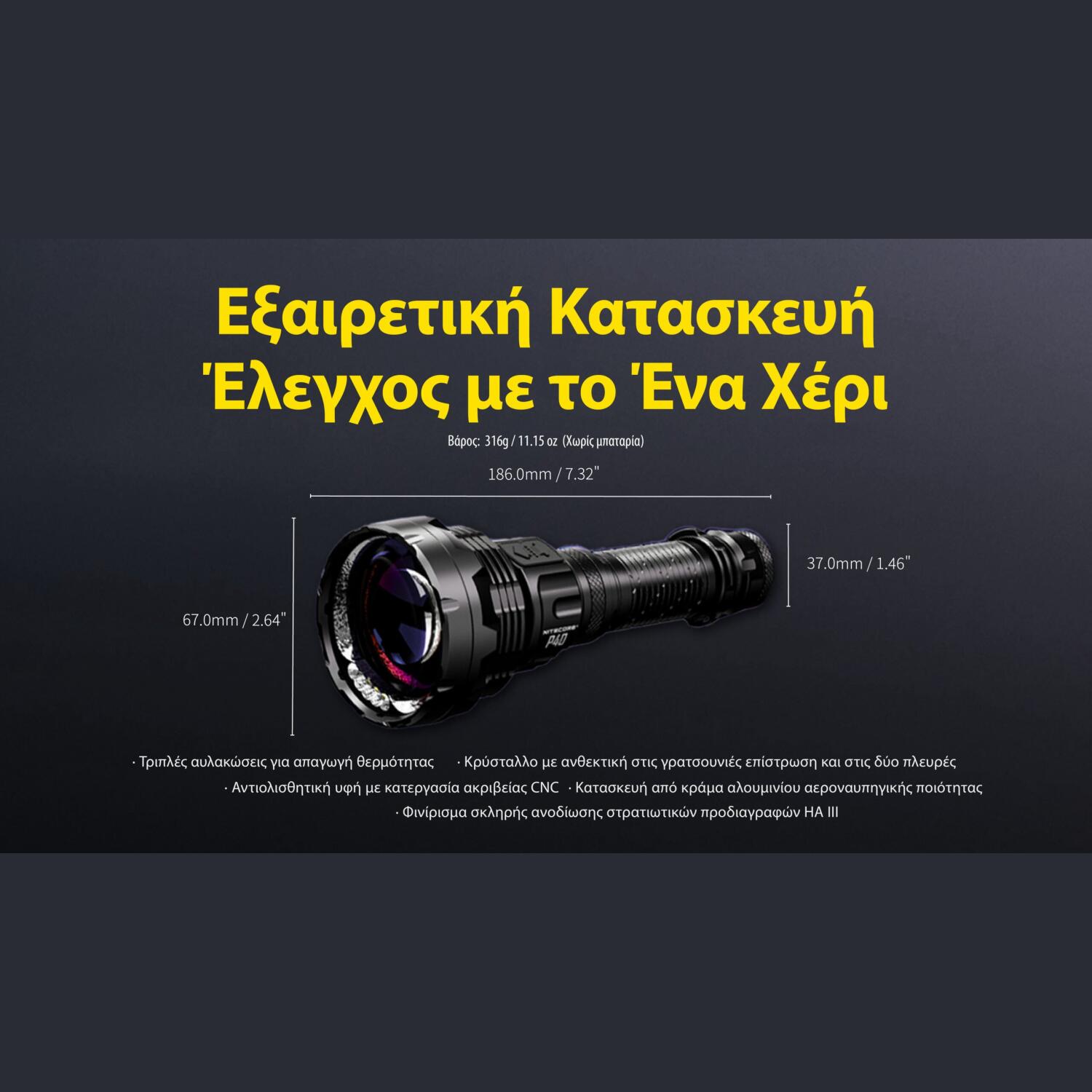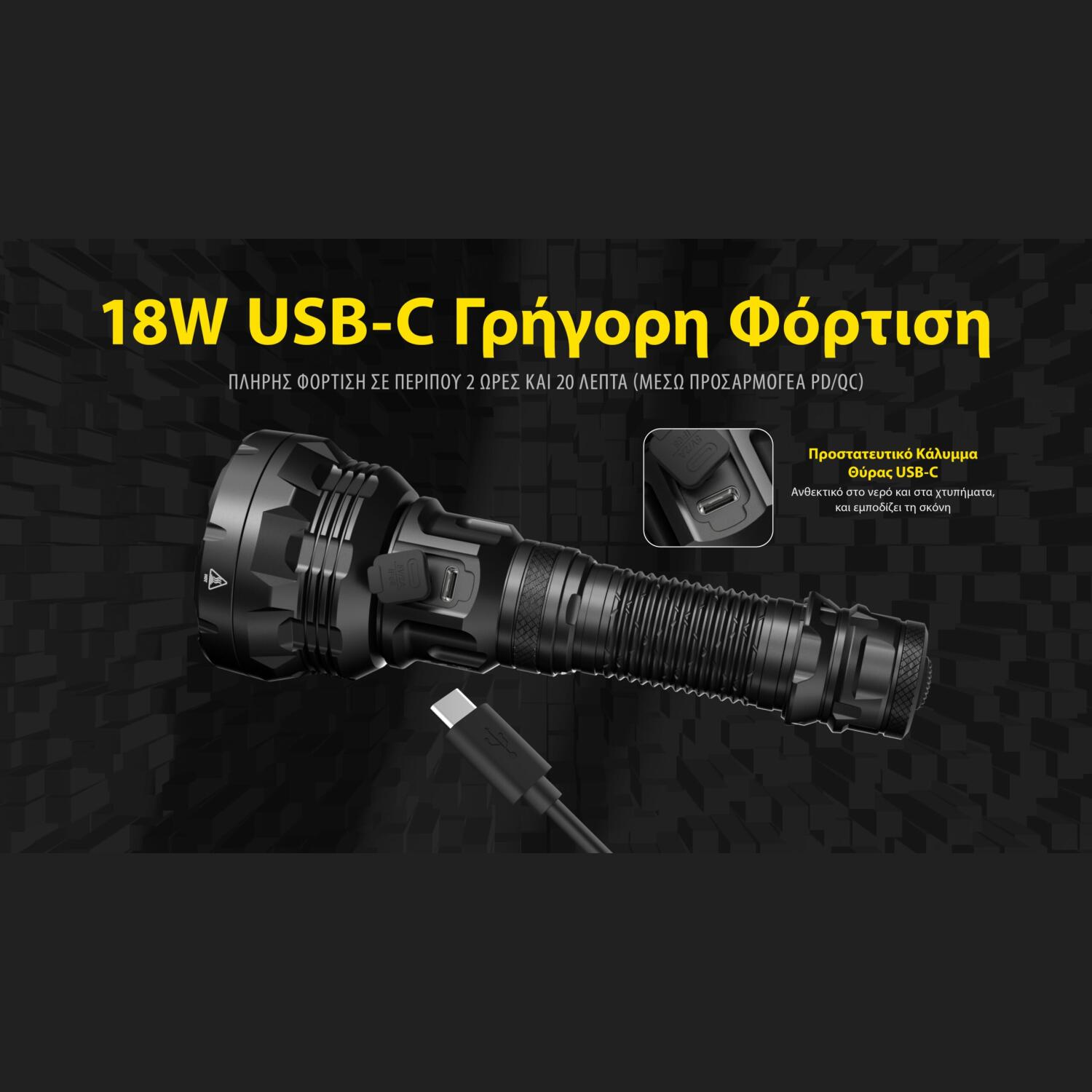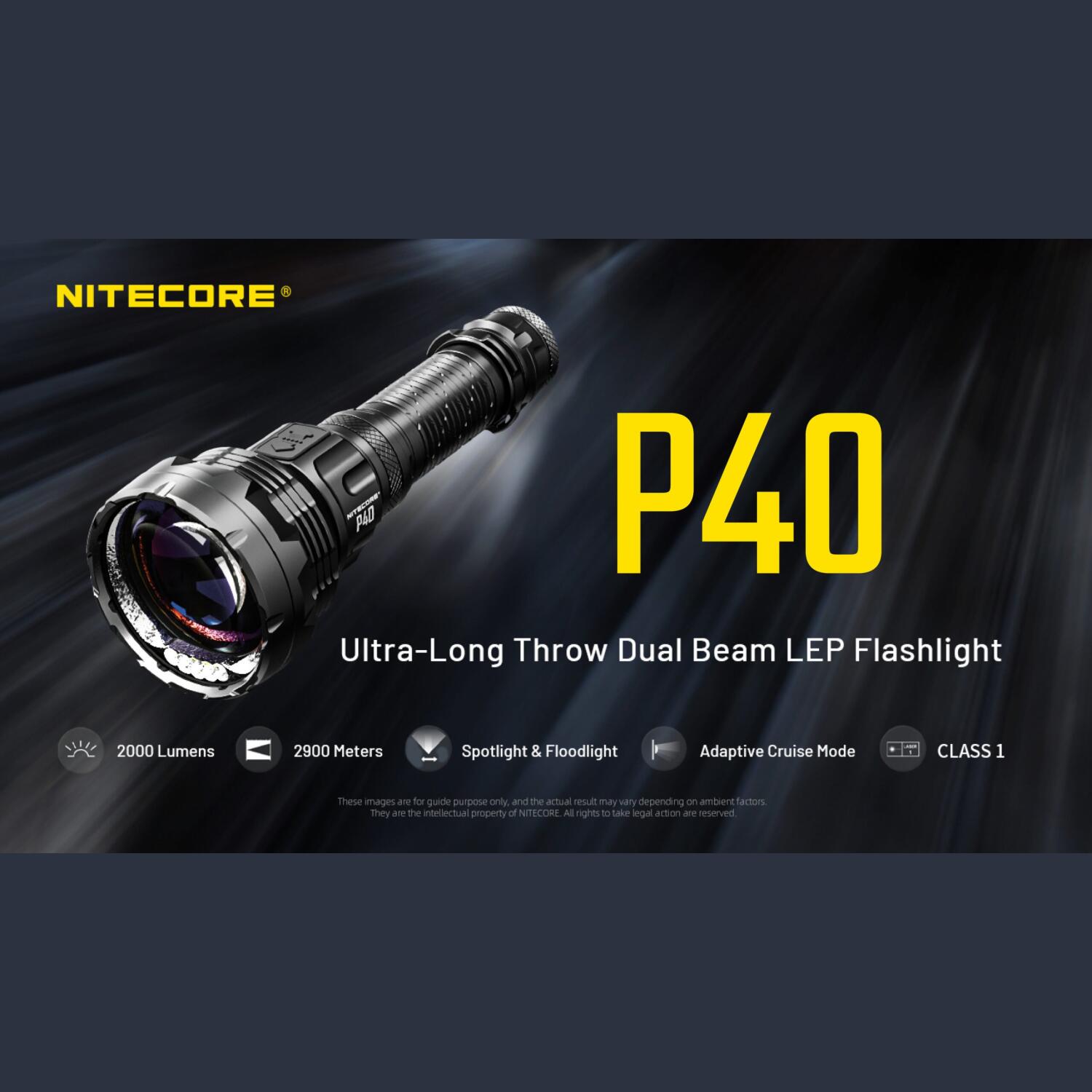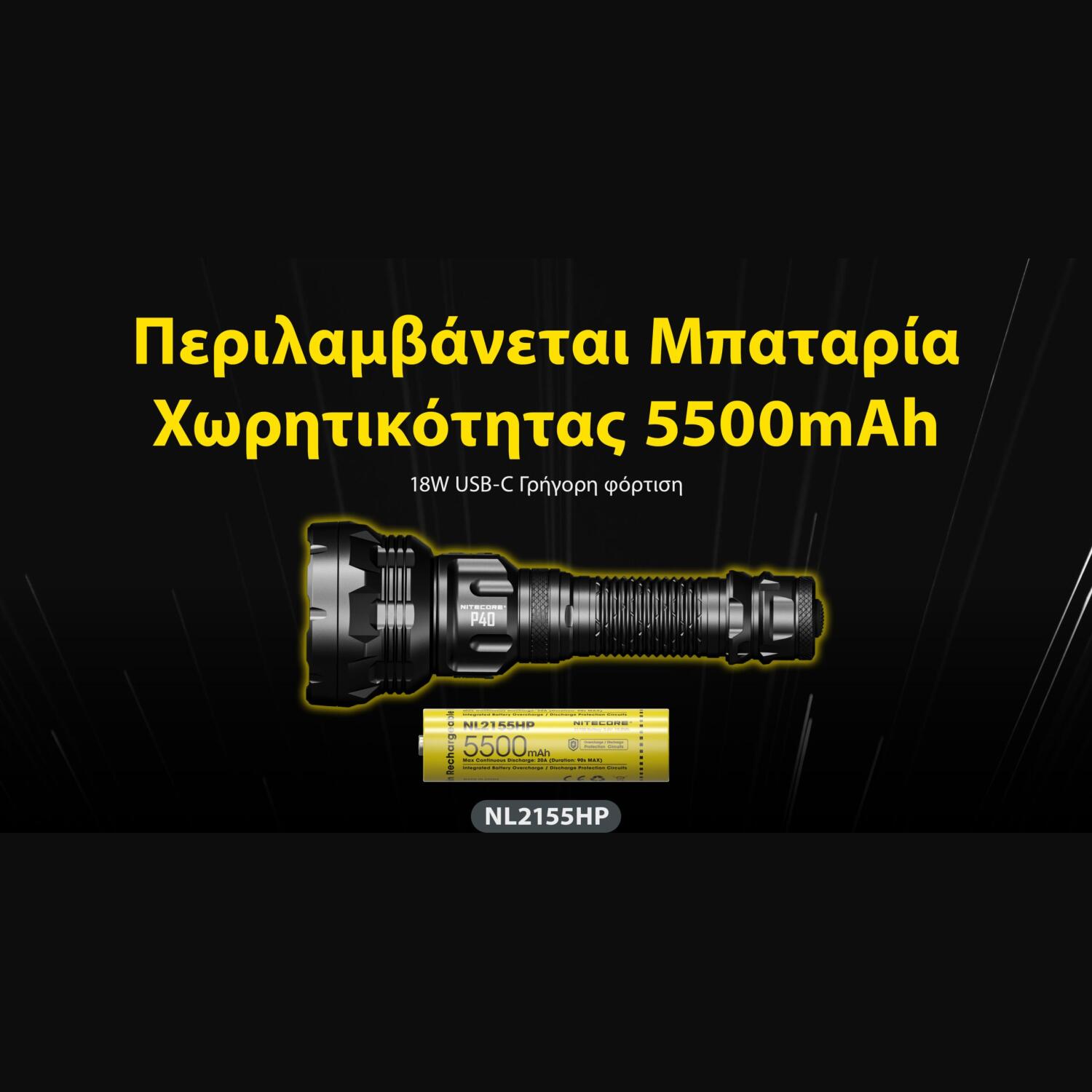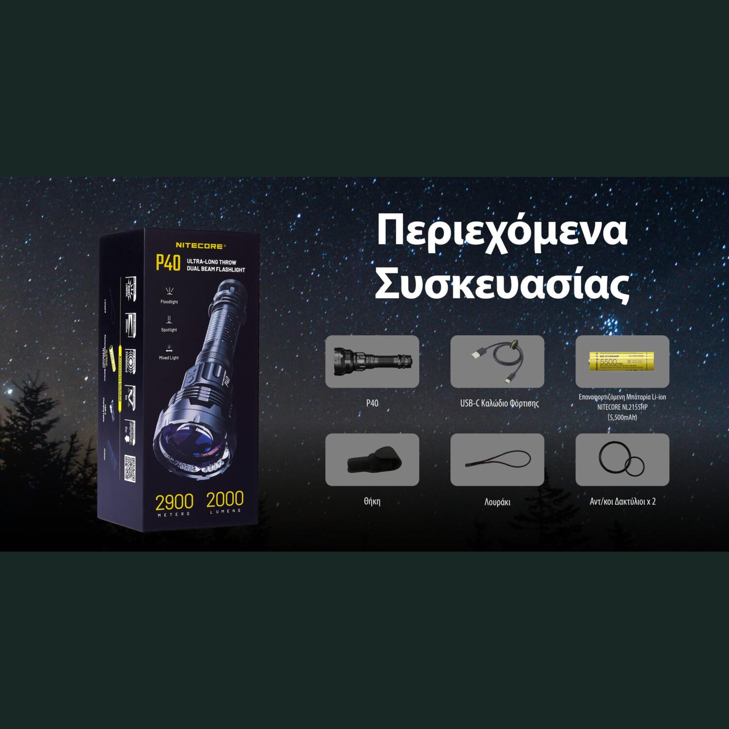 Η συσκευασία περιλαμβάνει: 1 x Φακός Precise P40, 1 x Καλώδιο Φόρτισης USB-A σε Type-C, 1 x Λουράκι, 1 x Επαναφορτιζόμενη Μπαταρία Li-ion Nitcore NL2155HP 5.500mAh, 1 x Θήκη, 2 x Δακτύλιοι.