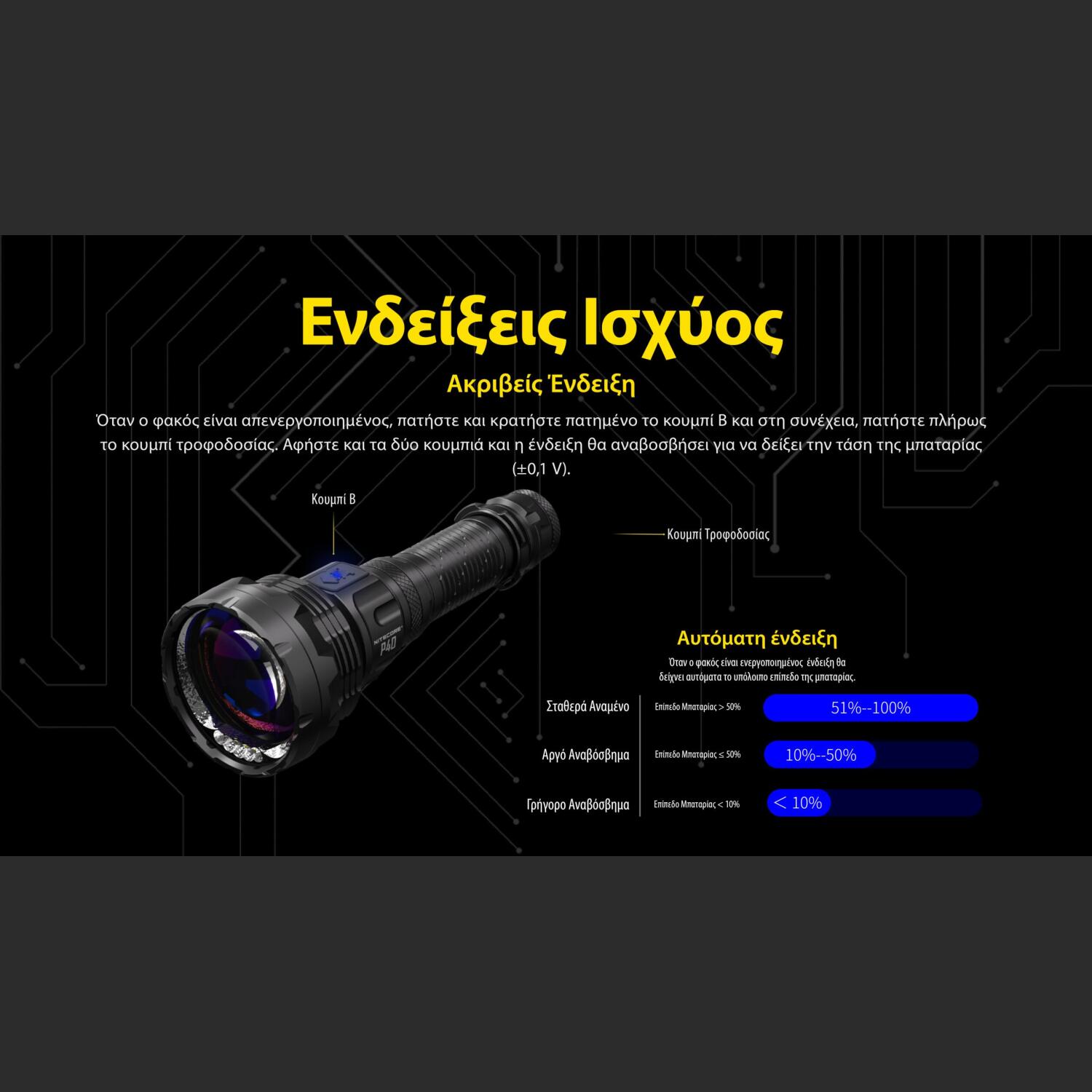 Ο φακός διαθέτει έξυπνο σύστημα ενδείξεων που σας ενημερώνει με ακρίβεια για το υπόλοιπο της μπαταρίας. Όταν ο φακός είναι απενεργοποιημένος, πατήστε και κρατήστε πατημένο το κουμπί Β και στη συνέχεια, πατήστε πλήρως το κουμπί τροφοδοσίας. Αφήστε και τα δύο κουμπιά και η ένδειξη θα αναβοσβήσει για να δείξει την τάση της μπαταρίας, ενώ όταν ο φακός είναι ενεργοποιημένος η ένδειξη θα δείχνει αυτόματα το υπόλοιπο επίπεδο της μπαταρίας. Σταθερά αναμμένο φως, 51% – 100% μπαταρία, αργό αναβόσβημα, 10% – 50% μπαταρία, γρήγορο αναβόσβημα, κάτω από 10% μπαταρία.
