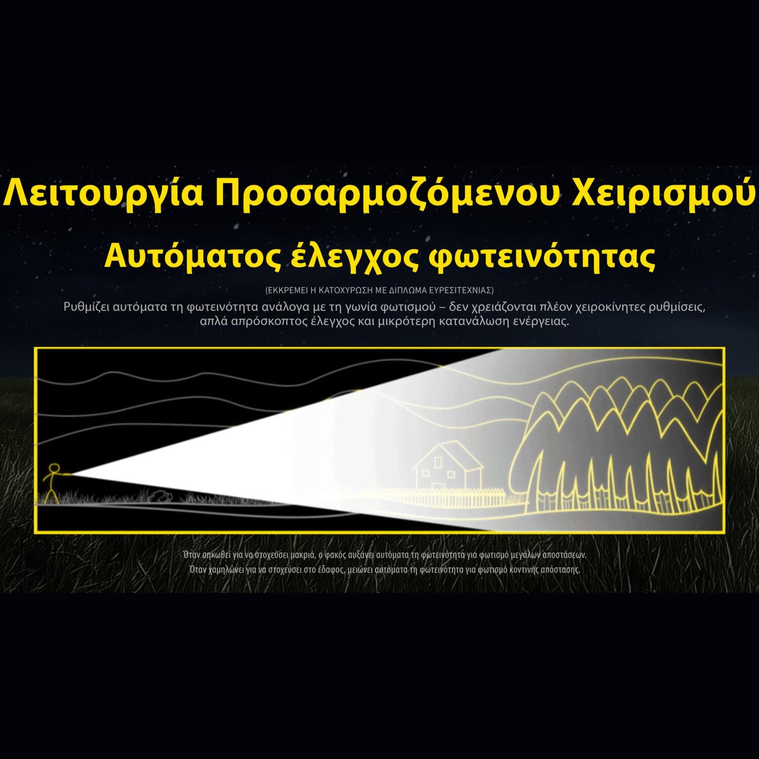 Η λειτουργία προσαρμοσμένου χειρισμού με αυτόματο έλεγχο φωτεινότητας ρυθμίζει αυτόματα τη φωτεινότητα ανάλογα με τη γωνία φωτισμού, χωρίς καμία χειροκίνητη ρύθμιση, απλά απρόσκοπτος έλεγχος και μικρότερη κατανάλωση ενέργειας. Όταν σηκωθεί για να στοχεύσει μακριά, ο φακός αυξάνει αυτόματα τη φωτεινότητα για φωτισμό μεγάλων αποστάσεων. Αντίθετα, όταν χαμηλώνει για να στοχεύσει στο έδαφος, μειώνει αυτόματα τη φωτεινότητα για φωτισμό κοντινής απόστασης.