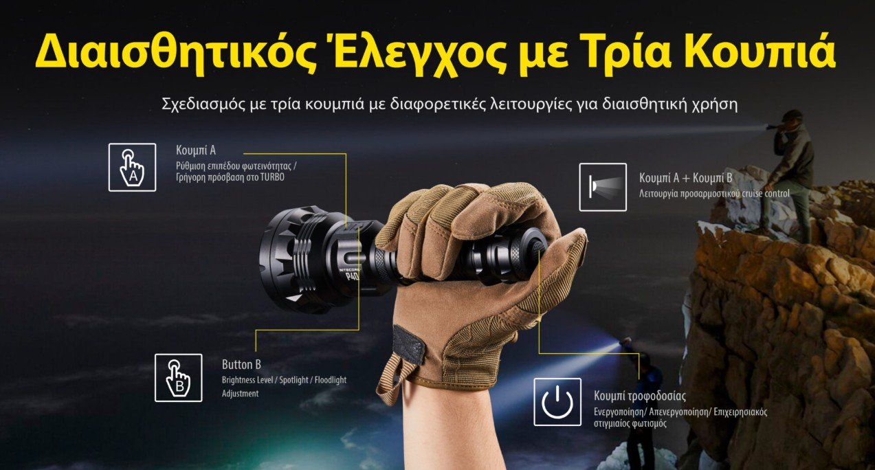Διαθέτει διαισθητικό έλεγχο με τρία κουμπιά, σχεδιασμένα για εύκολη χρήση. Κουμπί A για ρύθμιση επιπέδου φωτεινότητας και γρήγορη πρόσβαση στη λειτουργία Turbo. Κουμπί B για επιλογή επιπέδου φωτεινότητας, εστίαση σε spotlight ή ρύθμιση σε floodlight. Κουμπί A + B για ενεργοποίηση της λειτουργίας προσαρμοστικού cruise control. Κουμπί τροφοδοσίας για ενεργοποίηση, απενεργοποίηση και επιχειρησιακός στιγμιαίος φωτισμός.