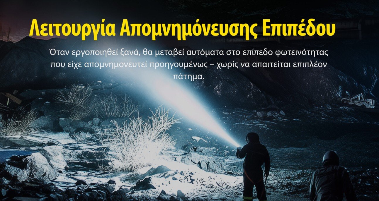 Με την λειτουργία απομνημόνευσης επιπέδου, όταν ενεργοποιηθεί ξανά, θα μεταβεί αυτόματα στο επίπεδο φωτεινότητας που είχε απομνημονευτεί προηγουμένως, χωρίς να απαιτείται επιπλέον πάτημα. Είναι σχεδιασμένος με εξαιρετική κατασκευή, για εύκολο χειρισμό με το ένα χέρι. Επίσης, διαθέτει τριπλές αυλακώσεις για απαγωγή θερμότητας και κρύσταλλο με διπλή επίστρωση, ανθεκτική στις γρατζουνιές σας προσφέρει εξαιρετική ποιότητα χρήσης.