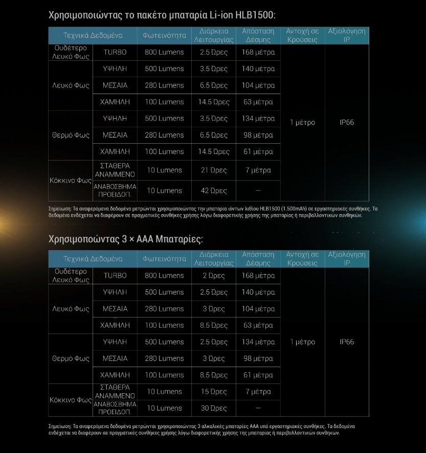 Σημείωση: Όλα τα τεχνικά στοιχεία έχουν μετρηθεί σε συνθήκες εργαστηρίου. Τα αποτελέσματα μπορεί να διαφέρουν στο φυσικό/πραγματικό περιβάλλον εξαιτίας διαφορετικής χρήσης της μπαταρίας ή των περιβαλλοντικών συνθηκών. Ο φακός θα ξεκλειδωθεί αυτόματα όταν αντικατασταθεί η μπαταρία ενώ είναι κλειδωμένος.