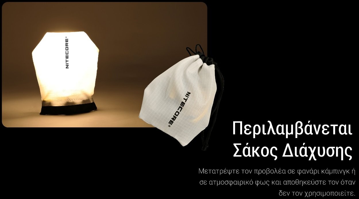 Κατασκευασμένο από ανθεκτικό υλικό PC υψηλής αντοχής, προσφέρει εξαιρετική προστασία από κρούσεις και παραμένει ανθεκτικό ακόμη και σε χαμηλές θερμοκρασίες. Τέλος, περιλαμβάνεται πρακτικός σάκος διάχυσης, που μετατρέπει εύκολα τον φακό σας σε φανάρι κάμπινγκ ή σε απαλό ατμοσφαιρικό φως. Ιδανικός τόσο για χρήση όσο και για αποθήκευση όταν ο φακός δεν χρησιμοποιείται.