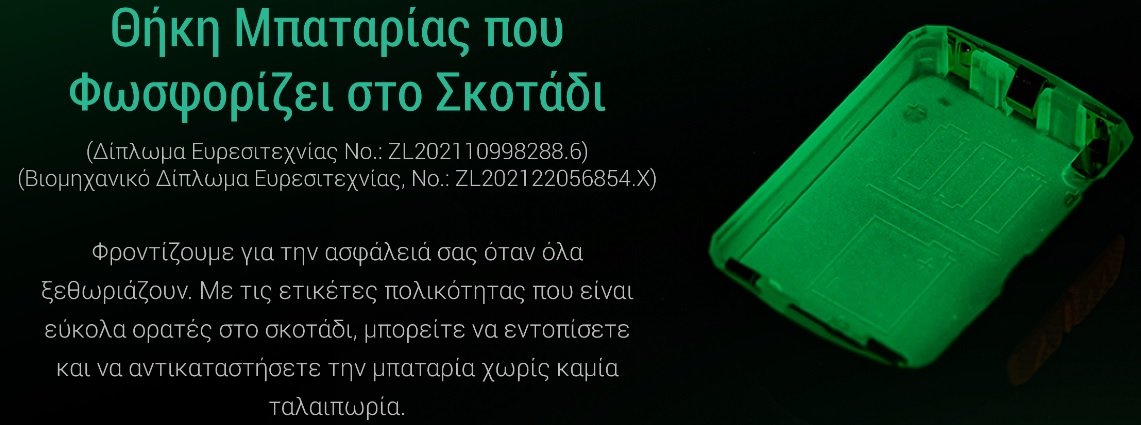 Επίσης, διαθέτει μία θήκη μπαταρίας με δίπλωμα ευρεσιτεχνίας Νο: ZL202110998288.6 και βιομηχανικό δίπλωμα ευρεσιτεχνίας Νο: ZL202122056854.X., η οποία φωσφορίζει στο σκοτάδι, προσφέροντας απόλυτη ευκολία ακόμα και σε χαμηλό φωτισμό. Με τις ετικέτες πολικότητας που είναι εύκολα ορατές στο σκοτάδι, μπορείτε να εντοπίσετε και να αντικαταστήσετε την μπαταρία χωρίς καμία ταλαιπωρία. Σχεδιασμένο με ρυθμιζόμενη γωνία κλίσης έως 90° και με θήκη μπαταρίας η οποία ανοίγει πλήρως στις 180°, εξασφαλίζοντας εύκολη πρόσβαση.