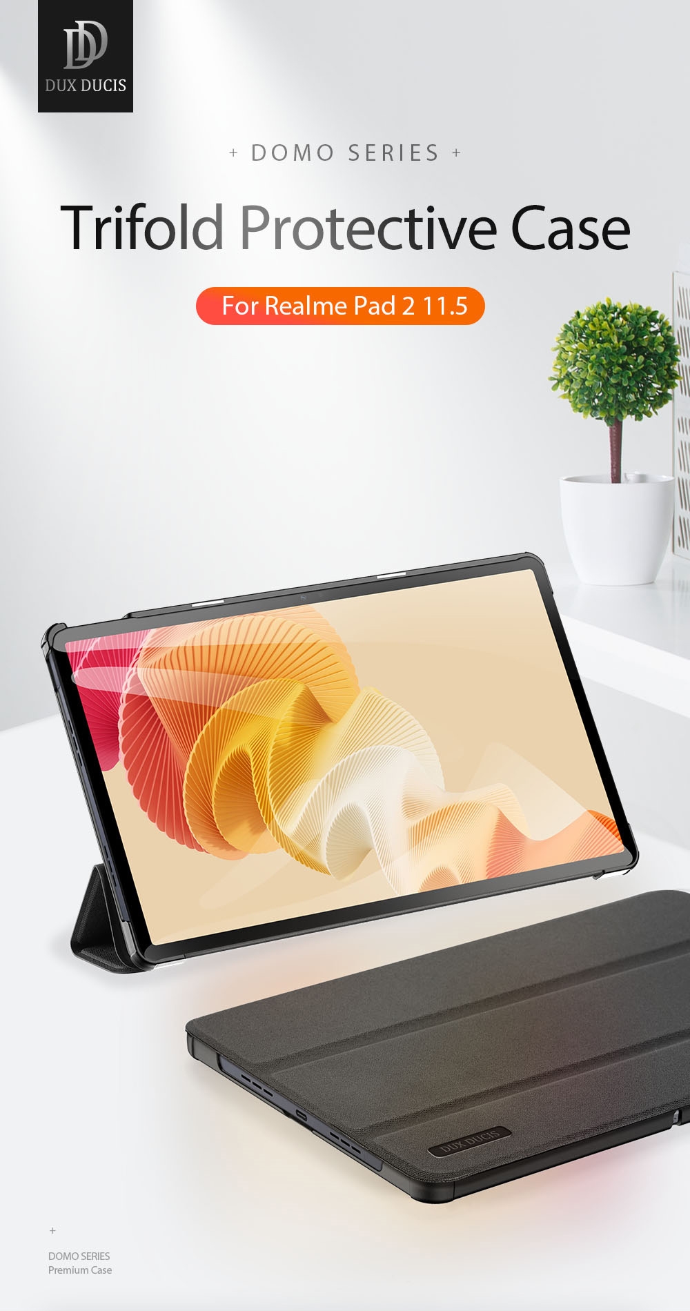 Η νέα σειρά της DuxDucis, Domo, είναι κατασκευασμένη από συνθετικό δέρμα υψηλής ποιότητας και βάση από ανθεκτικό πλαστικό, όπου τοποθετείτε το tablet σας και το προστατεύει από πτώσεις και κραδασμούς. Χάρη στην έξυπνη κατασκευή του, μπορεί να χρησιμοποιηθεί και σαν βάση για διάβασμα, πλοήγηση στο internet, πληκτρολόγηση ή παρακολούθηση multimedia υλικού.