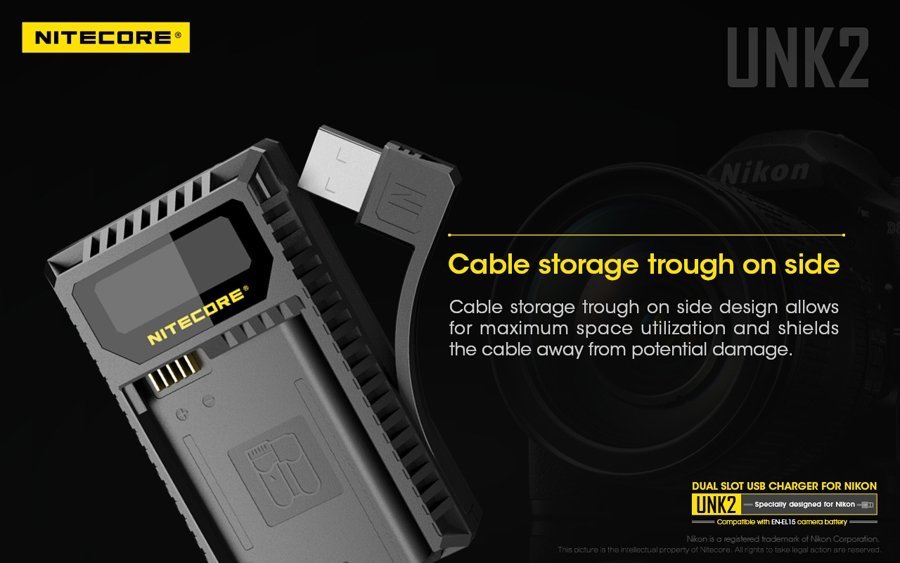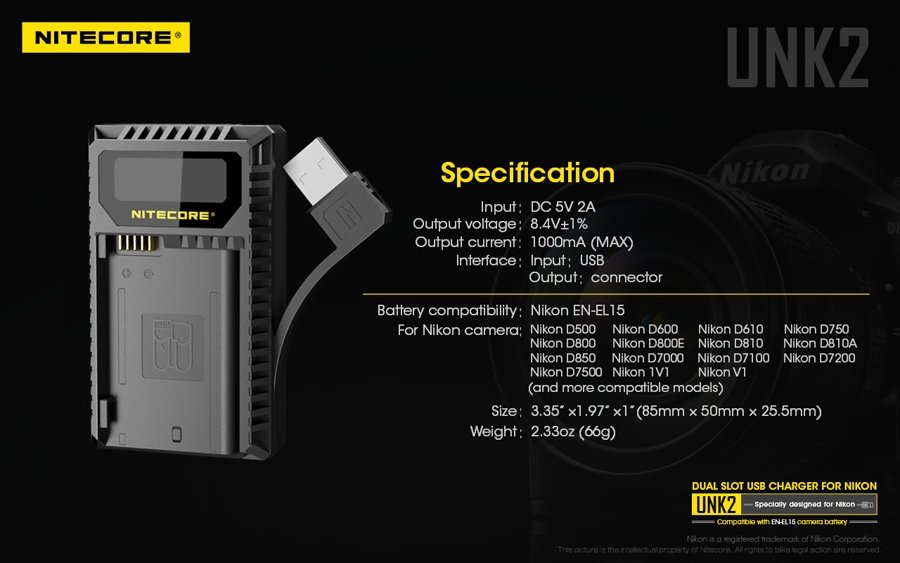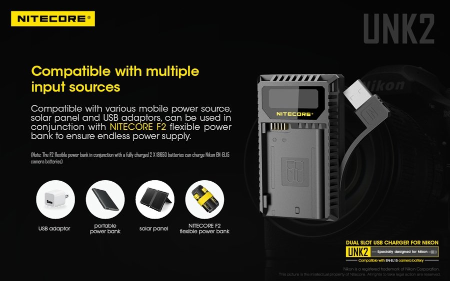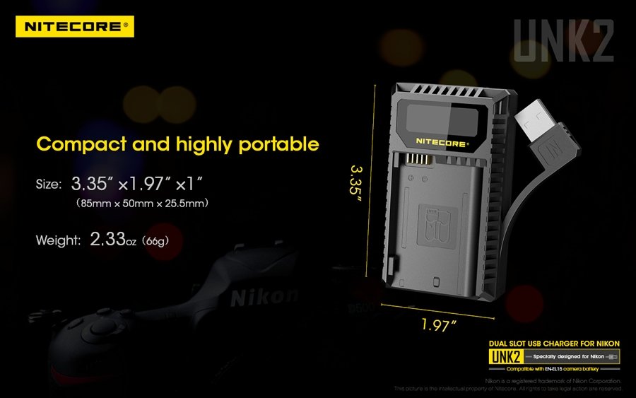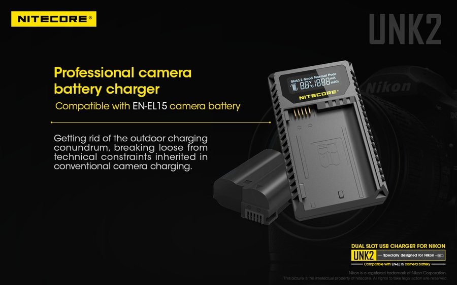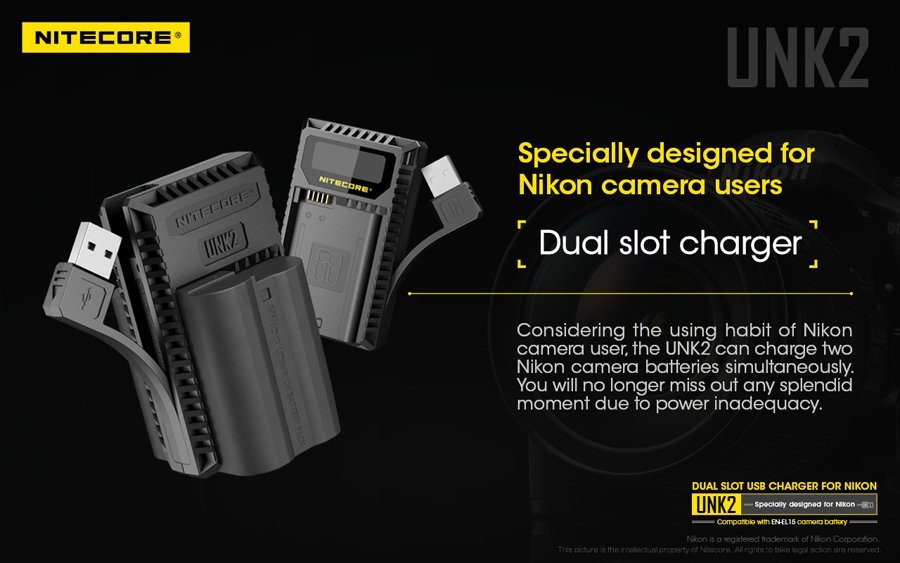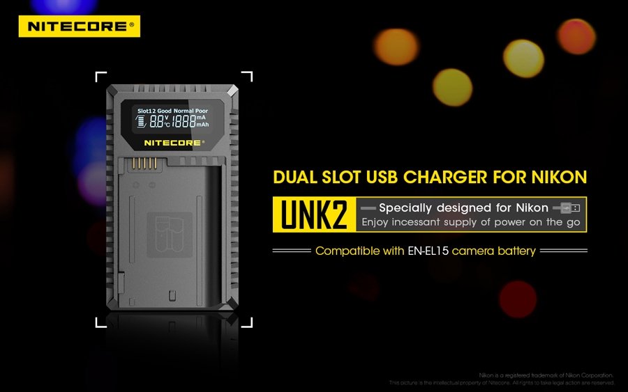 Ο φορτιστής UNK2 της Nitecore είναι ένας επαγγελματικός φορτιστής δύο θέσεων για μπαταρίες φωτογραφικών μηχανών Nikon και είναι συμβατός με την μπαταρία EN-EL15. Aπολαύστε την απεριόριστη παροχή ενέργειας εν κινήσει! Σας απελευθερώνει από το αίνιγμα της φόρτισης σε εξωτερικούς χώρους και σπάει τα δεσμά των τεχνικών περιορισμών που κληρονομήθηκαν από την συμβατή φόρτιση μπαταριών για φωτογραφικές μηχανές.