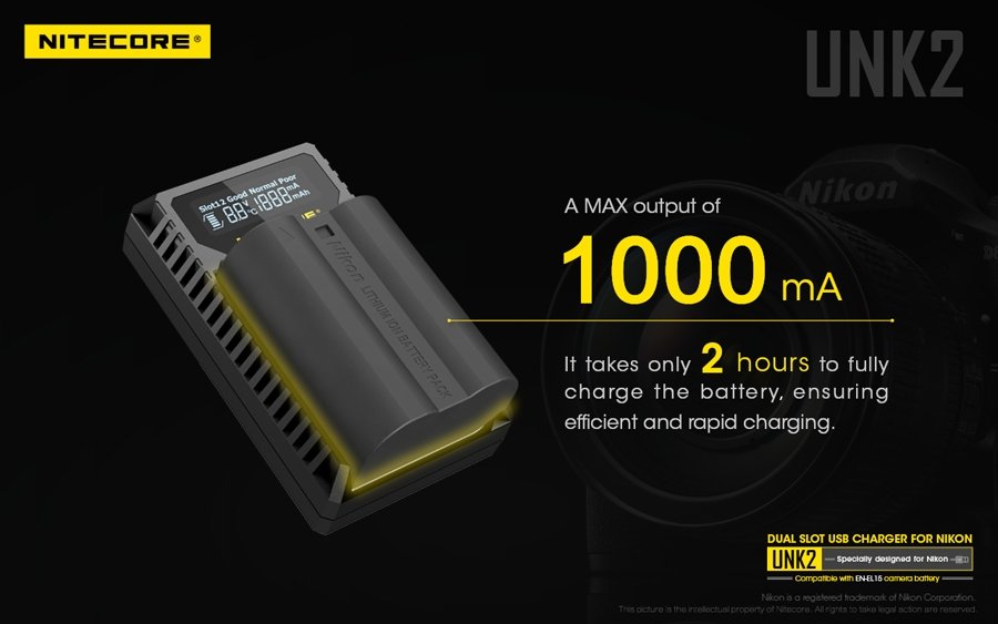 Επίσης διαθέτει δύο θέσεις φόρτισης και έχοντας λάβει υπόψη τις συνήθειες των χρηστών φωτογραφικών μηχανών Nikon, ο UNK2 μπορεί να φορτίσει δύο μπαταρίες ταυτόχρονα. Δεν θα χάσετε ποτέ καμία εξαιρετική στιγμή από απώλεια ενέργειας. Με μέγιστο ρεύμα φόρτισης που φθάνει το 1Α και χρειάζεται μόνο 2 ώρες για να φορτίσει μία μπαταρία, εξασφαλίζοντας γρήγορη και αποδοτική φόρτιση.