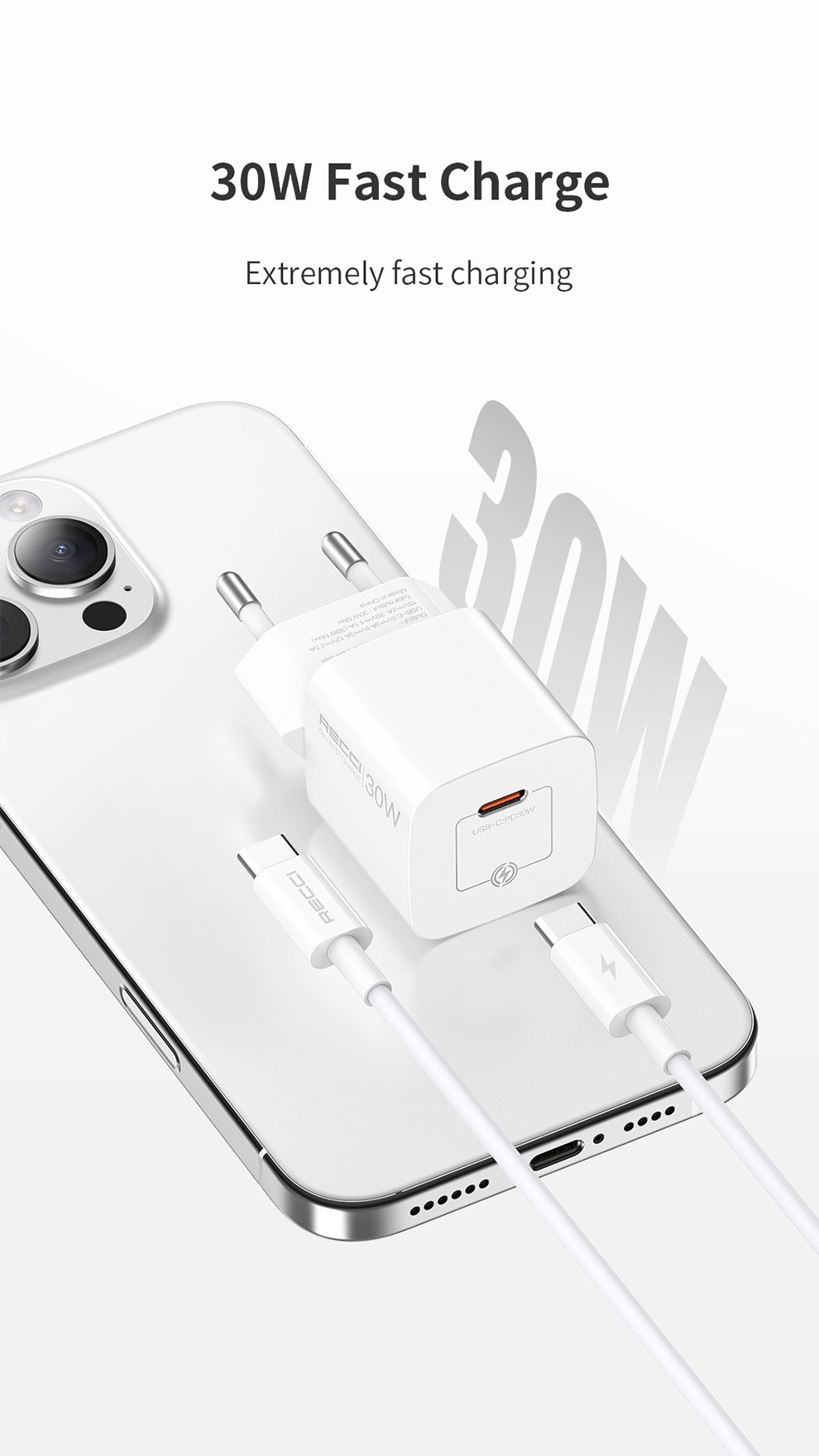 Ο Universal φορτιστής τοίχου RC77ECC της Recci σας επιτρέπει να φορτίζετε γρήγορα και με ασφάλεια όλες τις συσκευές σας, όπως τα αγαπημένα σας smartphone, tablet, laptop, κονσόλες παιχνιδιών και όλες τις συσκευές με θύρα Type-C και είναι εξοπλισμένος με μία θύρα φόρτισης Type-C, PD30W.