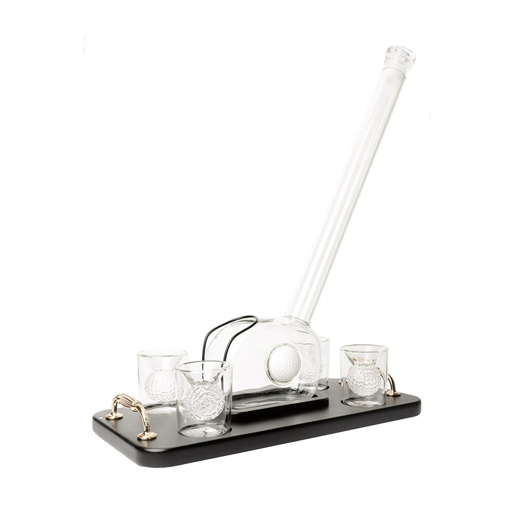 Παρέχοντας όχι μόνο μια καράφα με πώμα που θυμίζει golf club, αλλά και τέσσερα ποτήρια σε σχήμα μπάλας γκολφ, και μία ξύλινη βάση για να ακουμπάει η καράφα και τα ποτήρια, με ασφάλεια. Με χωρητικότητα που φτάνει τα 750 ml και ποτήρια 45 ml το κάθε ένα, και κατασκευή από κρυστάλλινο γυαλί με τις περίτεχνες γυάλινες λεπτομέρειες, θα διατηρήσει το αγαπημένο σας ποτό αναλλοίωτο.