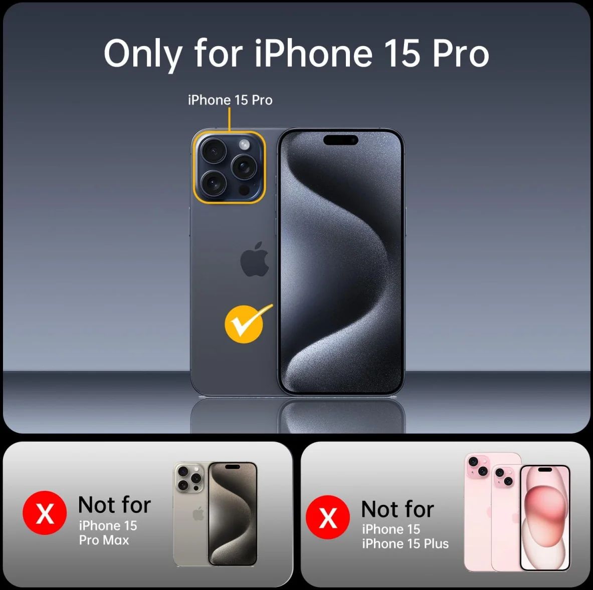 Η θήκη είναι συμβατή μόνο με το iPhone 15 Pro και όχι με το iPhone 15 Pro Max, 15 ή 15 Plus.