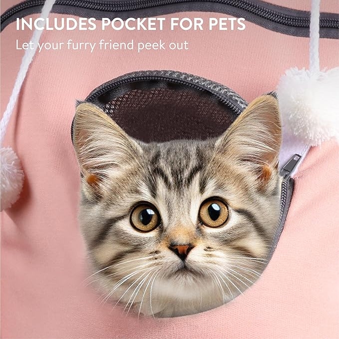 Σχεδιασμένο για να προσφέρει απόλυτη χαλάρωση τόσο σε εσάς όσο και στο κατοικίδιό σας, αυτό το μοναδικό φούτερ διαθέτει ειδική μπροστινή τσέπη-καγκουρό που επιτρέπει τη μεταφορά μικρών ζώων, όπως γάτες και σκύλους, προσφέροντας μια ζεστή, ασφαλή "φωλιά" για τον αγαπημένο σας φίλο.