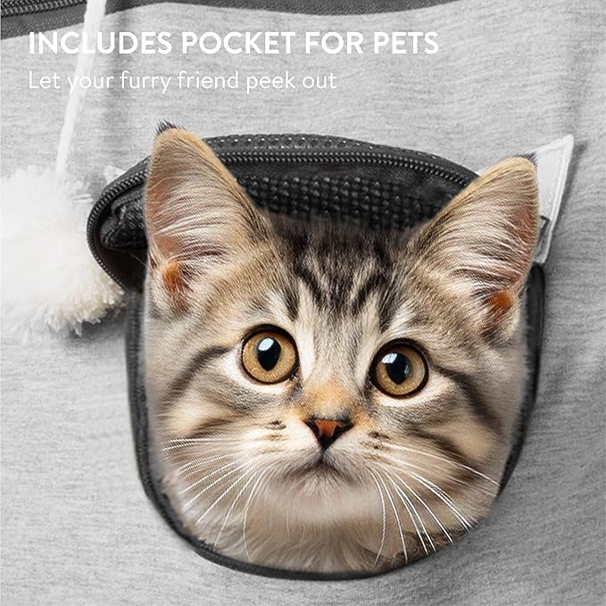 Σχεδιασμένο για να προσφέρει απόλυτη χαλάρωση τόσο σε εσάς όσο και στο κατοικίδιό σας, αυτό το μοναδικό φούτερ διαθέτει ειδική μπροστινή τσέπη-καγκουρό που επιτρέπει τη μεταφορά μικρών ζώων, όπως γάτες και σκύλους, προσφέροντας μια ζεστή, ασφαλή "φωλιά" για τον αγαπημένο σας φίλο.